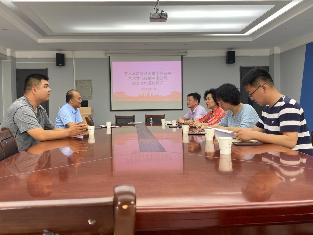 为带动学院毕业生更好地就业,进一步深化产教融合,为企业输送高素质的专业化人才,实现专业与产业、企业、岗位对接。2022年6月17日下午4:00时,郑州升达经贸管理学院艺术学院与濮阳市明英杂技艺术文化传播有限公司校企合作签约仪式在艺术学院会议室顺利举行,参加仪式的有濮阳市明英杂技艺术文化传播有限公司校企合作部魏智伟经理、市场部栗得恩经理、艺术学院院长吴柏林、院党委书记张小雁、副院长池浩东、教学秘书李赵法和就业专员郭称心。签约仪式由党委书记张小雁主持。