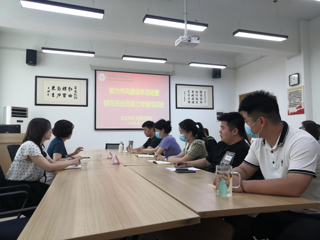 为进一步落实能力作风建设年要求,提升辅导员的业务能力和综合素质,6月17日上午,文法学院与外国语学院联合举办的“能力作风建设年培训——辅导员业务能力培训(第六场)”在教学一号楼文法学院会议室314举行。本次培训内容为观摩全国和全省辅导员职业能力大赛,文法学院行政秘书郑玲玲、外国语学院行政秘书丁玥及两个学院全体辅导员参加本次培训活动。
