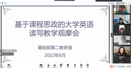 2022年6月23日上午9时,基础部第二教研室组织开展了基于课程思政的大学英语读写线上教学观摩会,参会人员有基础部王莉莉主任及全体教研室老师。