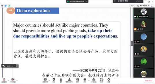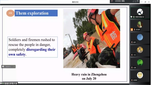 会议第二项,为了积极响应并落实学校安排的评建任务,由李璐老师为大家展示自己的基于课程思政的大学英语课堂教学,李璐老师的课件制作精美,内容丰富,英语口语流利,课程内容精彩纷呈,并巧妙结合了相关的课程思政元素。全体老师通过观摩、学习、讨论,深挖课程思政内涵,真正理解什么是课程思政。并以团队协作的形式完成下学期开设课程的思政设计,相关设计要符合《纲要》要求,与课程内容紧密结合,同时又能润物无声,避免学生抵触心理。