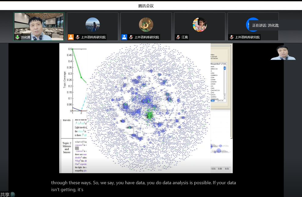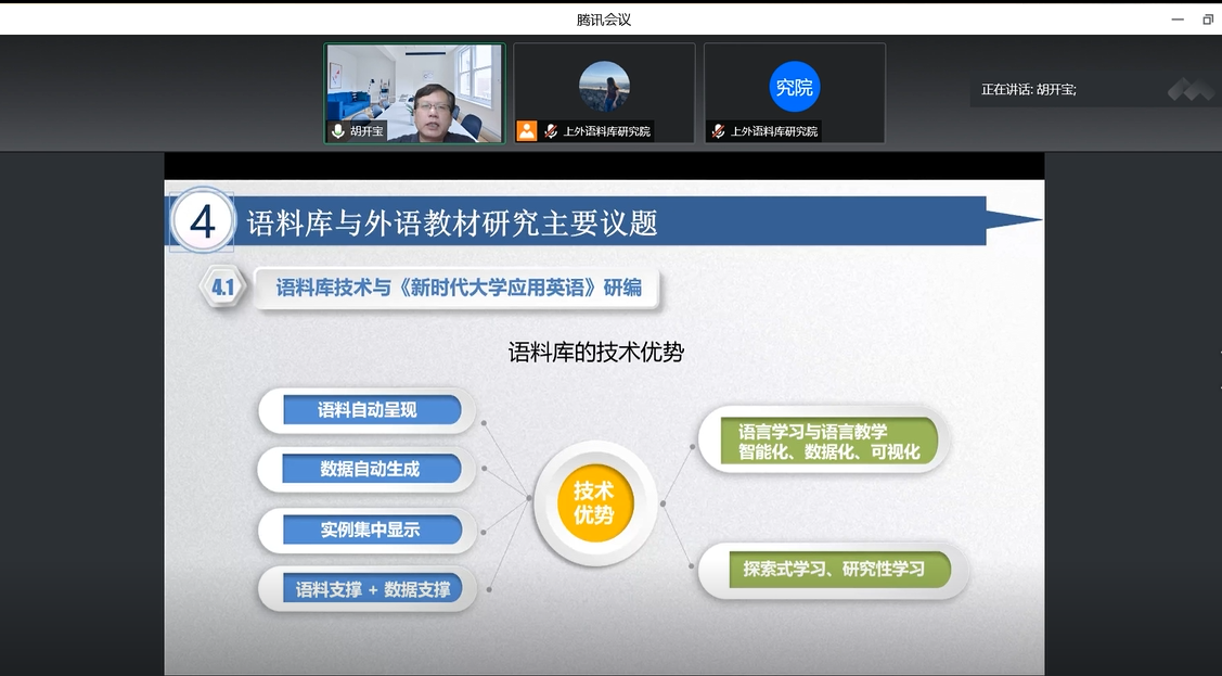 上海外国语大学语料研究院院长胡开宝教授带来了题为“语料库与外语教材编写的研究”的讲座。为我们指出了外语教材研究的问题:1.局限于少数研究领域,研究领域严重失衡,外语教材内部研究,外部研究及发展史研究需加强;2.外语教材研究成果不多,深度不够。3.研究方法单一,实证研究成果少。4.信息技术,语料库技术以及人工智能技术在外语教材编写中应用的研究有待开展,网络教材开发取得较快发展,但如何实现外语教学的数据化,直观化,可视化,自动化急需进一步研究。因此,开展语料库与外语教材研究,可以拓展并深化外语教材理论研究,改革外语教材研究方法,提高外语教材编写质量。