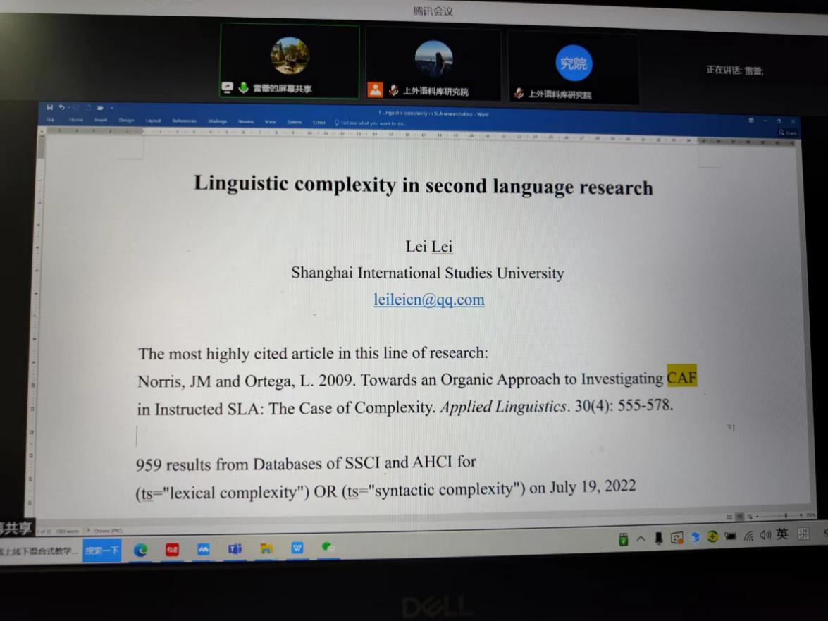 上海外国语大学的雷蕾教授讲授了基于语料库的语言复杂度研究。雷蕾教授深入浅出地为我们讲解了这一领域的前世今生,研究视角,及未来的研究方向。