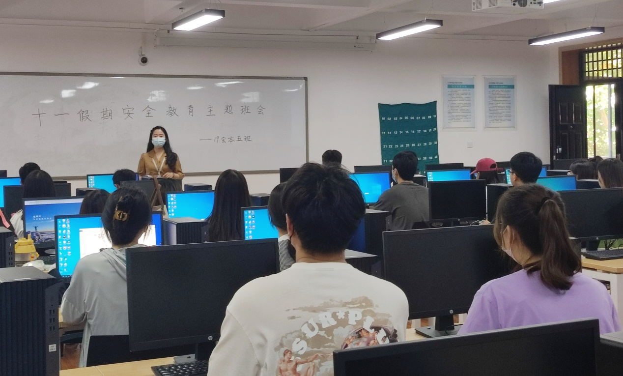 9月29日14:00,会计学院辅导员孟醒在商管楼306教室召开“十一”假期安全教育主题班会,19会本5班全体成员参加。