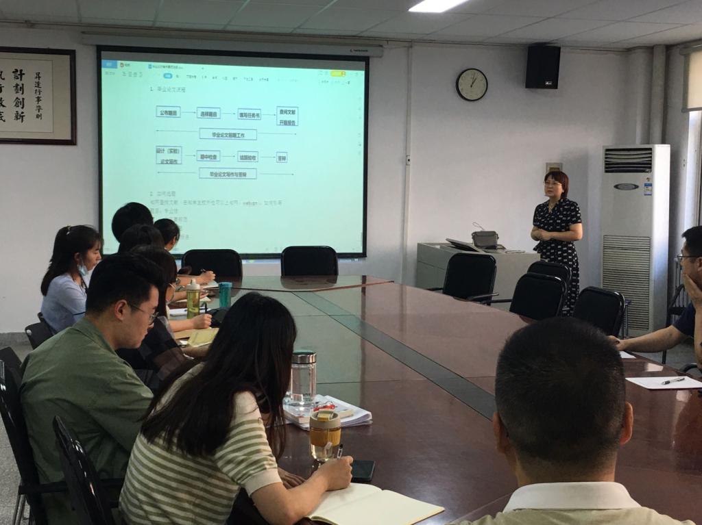 王丽娟老师对毕业设计的整个流程及各阶段的注意事项做了分享。她指出老师要指导好学生的选题、开题、答辩等各项工作,注意细节,把握时间节点。老师们针对指导学生毕业论文工作中的各种问题做了交流,为做好学院2023届毕业生的毕业论文(设计)工作奠定了良好基础。