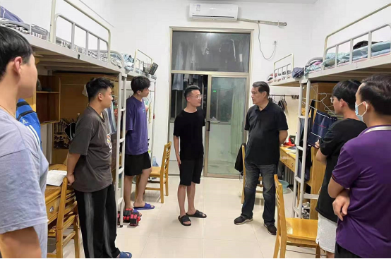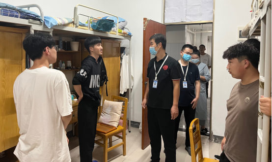 建工学院院长杨开云、书记韩炎涛带领教师、辅导员深入学生宿舍,实地了解学生当前的学习生活情况,为学生送去关心和问候,与同学们共同庆祝祖国生日快乐。院长、书记对同学们支持学校疫情防控,在校认真学习表示肯定,细致地关心同学们在校的学习、生活情况,纾解学生的心理压力,进一步加强对学生的人文关怀。
