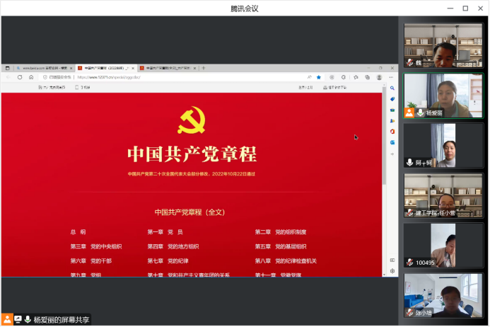 学党章,明方向,为了更好的促进党员教师坚定理想信念、强化宗旨意识,11月3日下午,工程管理教研室在线上开展学习《中国共产党章程》主题党日活动。会议由党支部书记杨爱丽同志主持,教研室全体教师参加了本次线上会议。