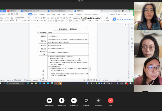 会上,马璟炜老师就《中国建筑史》课程进行了课程思政的分享。课程主要从以下三个方面进行思政教育:以史实培养学生的思想教育、以文化提高鉴赏品味、以哲学培养批判精神和历史发展观。