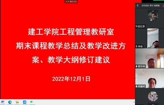 为了更好的完成本学期工作,2022年12月1日下午,工程管理教研室通过腾讯会议线上召开了2022-2023学年第一学期期末教学工作会。会议由教研室主任杨爱丽老师主持,工程管理教研室全体教师参会。