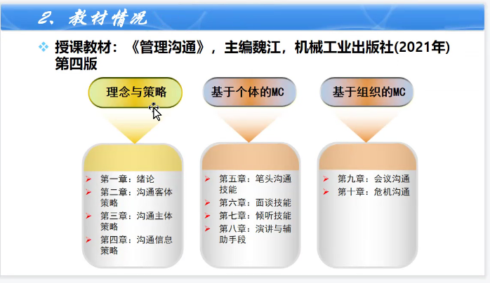 接着,《管理经济学》专业核心课程组的乔焱宁老师、李向民老师、孙璞老师,《质量管理》课程的陈晴晴老师、董飞老师,《管理学》课程的唐云老师分别从以下几个方面进行了交流。第一,课程教学设计的思路及方法以及如何设计、融入课程思政。第二,结合评估和目前的网络教学,在教学设计方面进行了哪些改进,以更好地引导、督促、监督学生更好地完成学习任务,提高学生网课学习的主动性和积极性,提高学习效果。第三,课程思政元素的搜集及无缝融入还需要团队成员的共同努力。董芳芳老师结合自己教授的《管理沟通》课程向大家展示了如何进行课程的逻辑梳理,结合不同章节内容如何进行教学方法和手段的设计,理论与实践相结合,提升学生的实际应用能力。