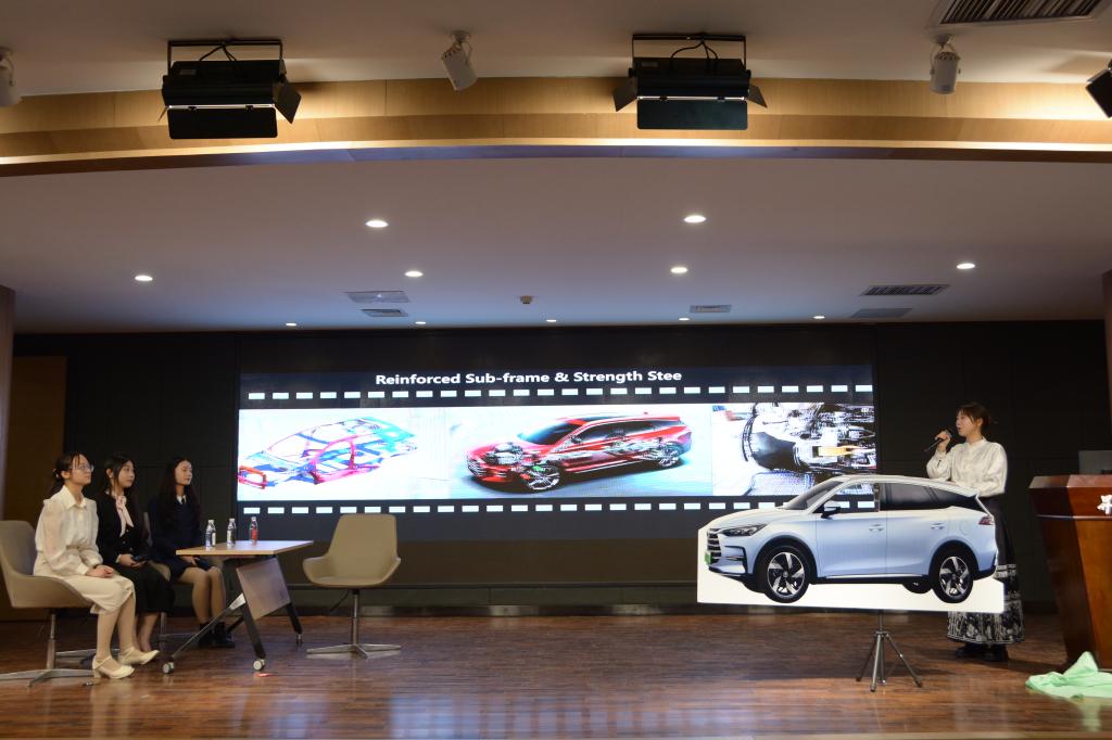 本次比赛的6支代表队来自2021级商务英语本科班和2023级商务英语专升本班,经过激烈的初赛选拔后脱颖而出。在6支参赛队纷纷完成首次亮相,主持人介绍了比赛规则、评分细则和奖项设置后,比赛正式开始。2023年是“一带一路”倡议提出十周年,因此本次赛题定为:选取一家参与“一带一路”建设的企业进行调研,不限河南本土或外省企业,分享该企业在参与建设中的机遇、挑战、努力和成果,包括但不限于研发设计、生产制造、经营管理、市场服务、对外贸易等方面,同时分析该企业如何在下一个十年实现更高质量发展,提出自己的看法或建议。沉稳大气的国药同仁堂,新能源乘用车销冠比亚迪,专业干练的小米科技,央企之光中国电建,智能家居解决方案专家美的,丝绸国潮万事利,选手们用流利的英语和精心制作的PPT详尽地讲述了各自的企业和品牌发展方案,赢得了观众们的阵阵欢呼与喝彩。