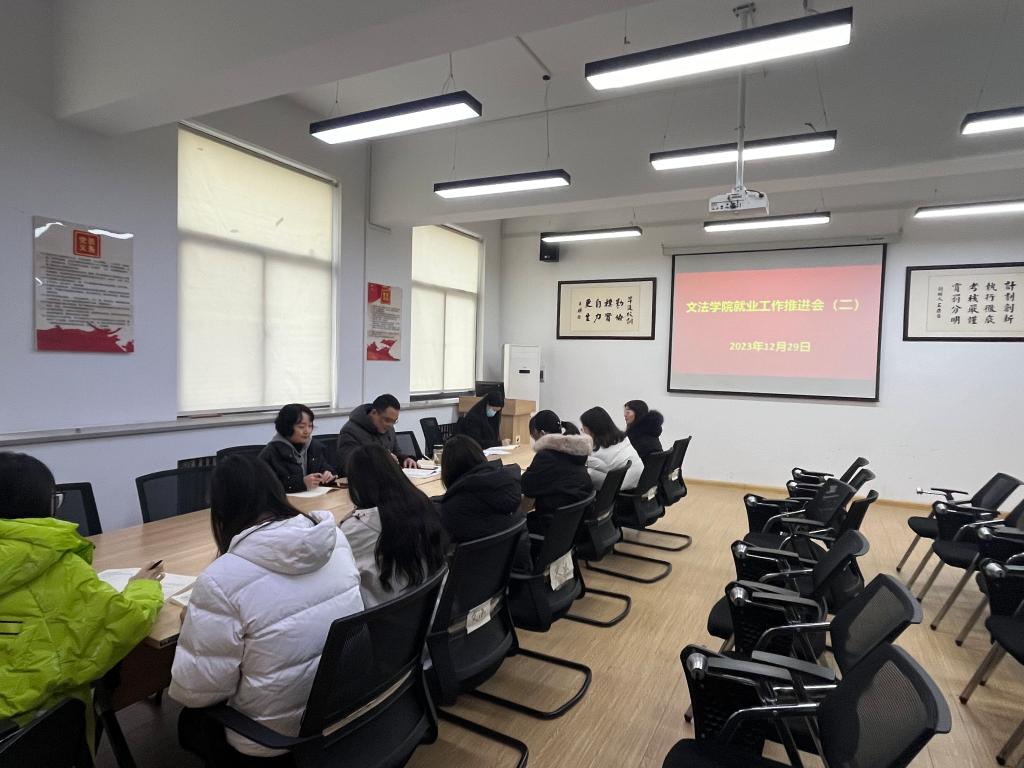 为全面落实党中央、国务院对高校毕业生就业工作的决策部署,进一步推进高质量就业工作,2023年12月29日下午,文法学院在1-314会议室召开2024届就业工作推进会(二)。学院党委书记刘晓川、行政秘书郑玲玲、就业专员吕凌云、2024届全体毕业班辅导员参加了会议。