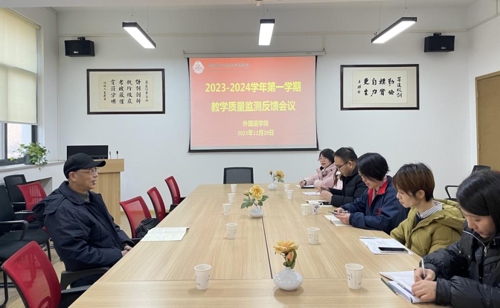 为进一步落实教学过程管理,保证学院教学工作有序、高质量进行,12月28日上午,外国语学院在1号楼206会议室召开了2023-2024学年第一学期的教学质量监测反馈会议。校督导叶定国教授莅临我院进行教学质量监测反馈,会议由院长崔瑾英教授主持,出席会议的有教学秘书祁胜利、各教研室主任及学院督导。