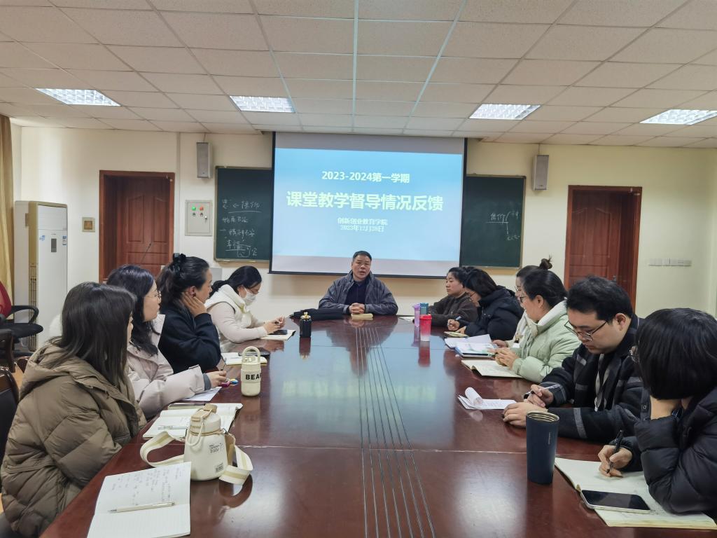 2023年12月28日,创新创业教育学院在商管楼115会议室召开本学期课堂教学督导情况反馈会议。我校教学督导员张茂松教授莅临学院指导工作,学院办公室主任、教学秘书胡素桂老师,就业创业教研室主任张宁老师,学院全体专任教师参加了本次会议。会议由胡素桂老师主持。