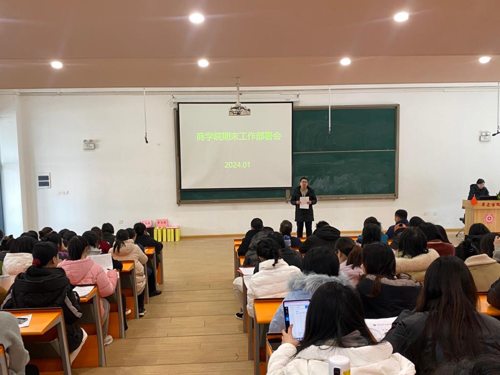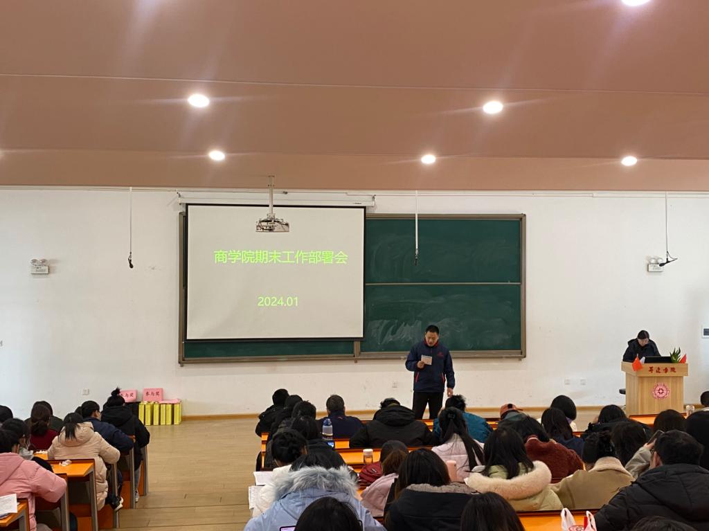 1月4日下午,商学院在教学二号楼116教室召开2023-2024学年第一学期期末工作部署会,院长白朋飞、党委书记郭峰、教学秘书马巧丽、行政秘书郗艳花及全体教职工参加此次会议,会议由马巧丽老师主持。