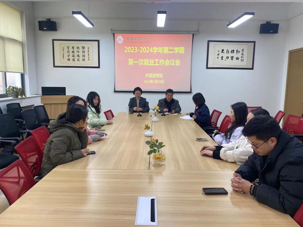 2024年2月29日上午10点,外国语学院在1号教学楼306会议室召开了2023-3024学年第二学期第一次就业工作会议,外国语学院党委书记石皓召主持召开了本次会议,外国语学院院长崔瑾英教授、外国语学院行政秘书丁玥老师、外国语学院23届、24届毕业生辅导员参加了本次会议。