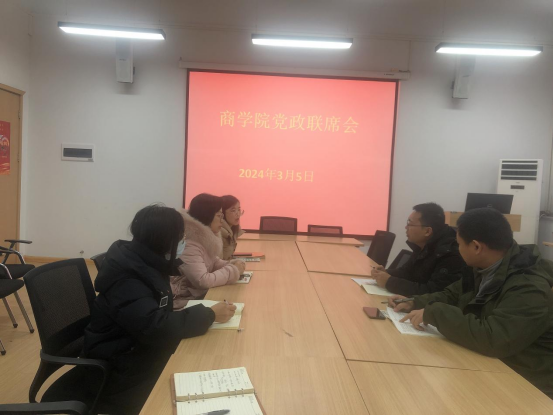 3月5日上午,商学院在教学楼2号楼315会议室召开党政联席会议,出席会议的有院长白朋飞、院党委书记郭峰、教学秘书马巧丽、行政秘书郗艳花、组织员杨利凯、党委委员胡好好。