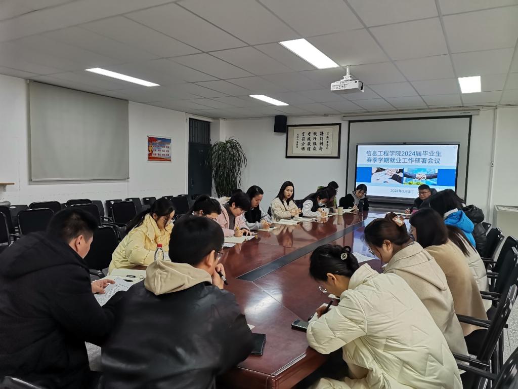 为保障我院2024届毕业生就业服务工作继续顺利开展,进一步提高就业质量,畅通学校、企业、学生之间的沟通渠道,信息工程学院于2024年3月5日在资讯楼104会议室召开“2024届毕业生春季学期就业工作部署会议”,党委书记李赵法、行政秘书王崇与全体辅导员参加本次会议。