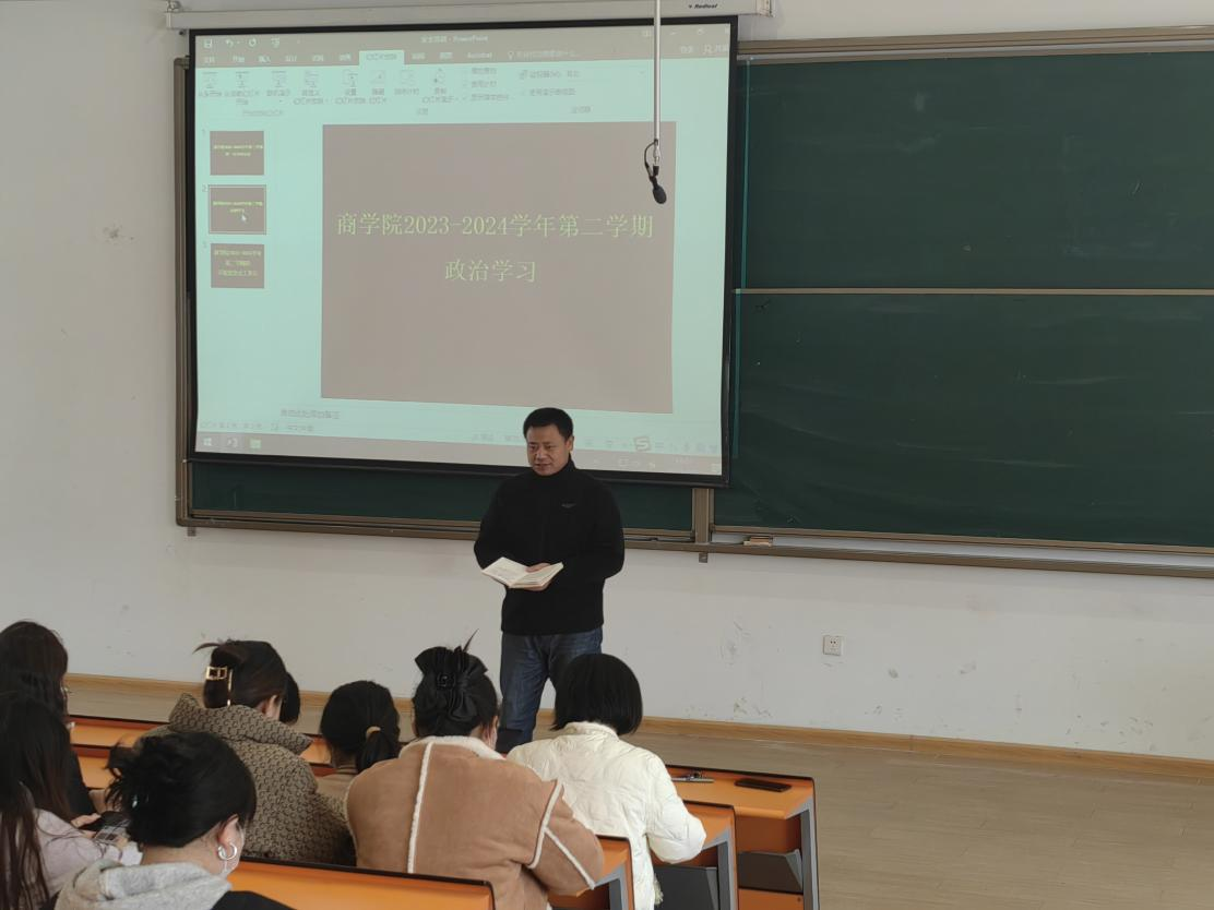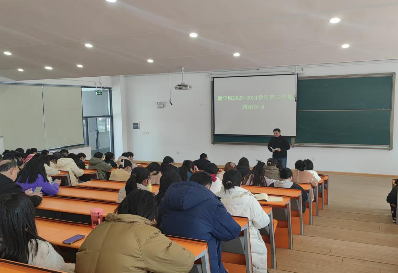 为深入学习贯彻习近平新时代中国特色社会主义思想,2024年3月7日下午,商学院在教学楼2号楼315室组织全体教职工开展政治学习。会议由党委书记郭峰主持,全体教职工参会。