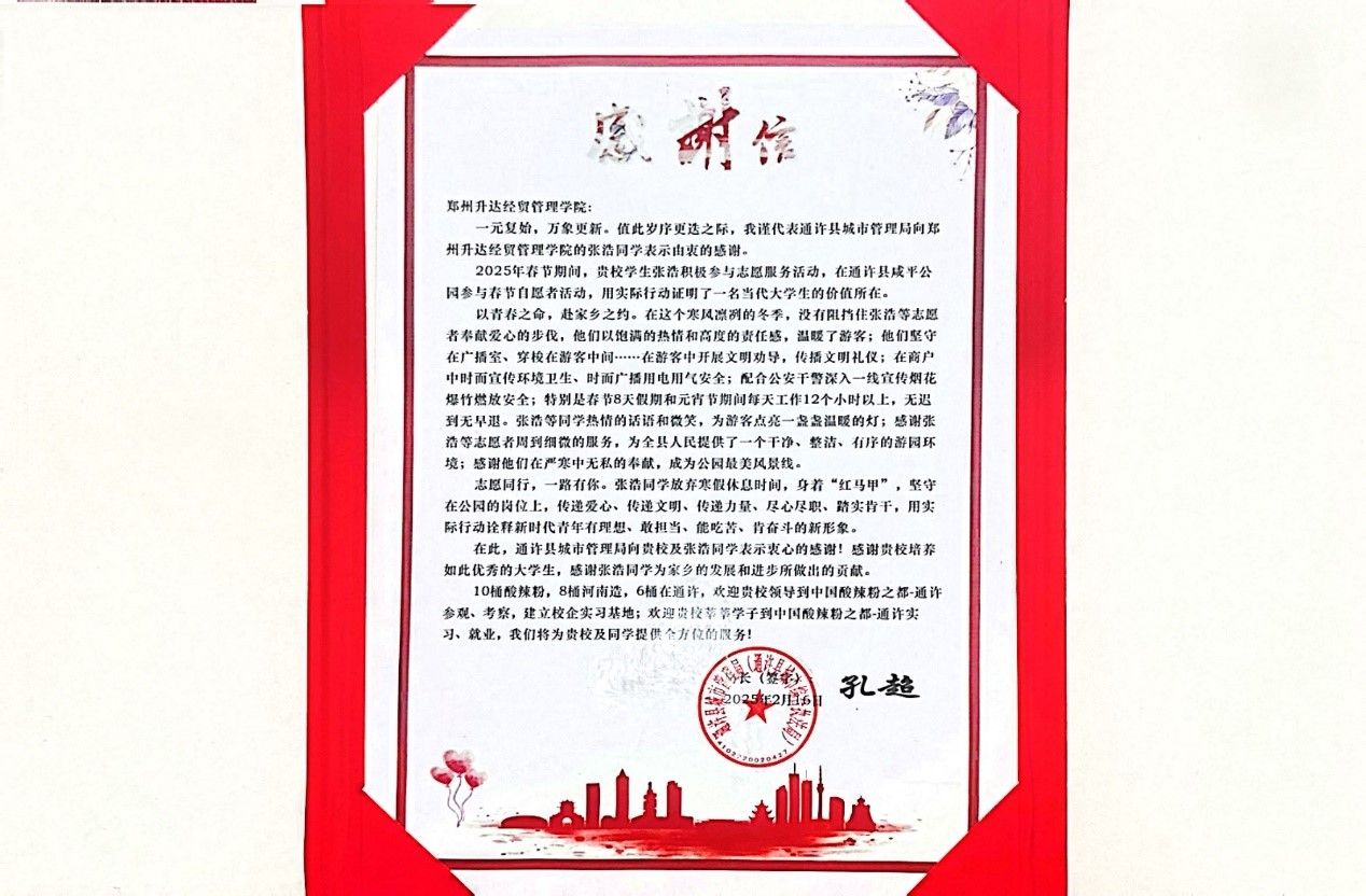 信中详述了在春节期间,张浩同学积极响应号召,加入通许县城平公园志愿服务队。面对连续8天的超长工作时间(每日12小时)和零下低温环境,他始终以饱满热情投入服务:从清晨到深夜,穿梭在游客间开展文明劝导、普及安全知识;配合公安干警宣传烟花爆竹禁燃政策;协助维护公园秩序,为市民营造了整洁有序、温馨祥和的节日环境。其专业负责的态度和灿烂的笑容,成为寒冬中最温暖的风景线。通许县城管局在信中表示:“张浩同学用实际行动诠释了新时代青年的责任担当,展现了升达学子的良好风貌。”