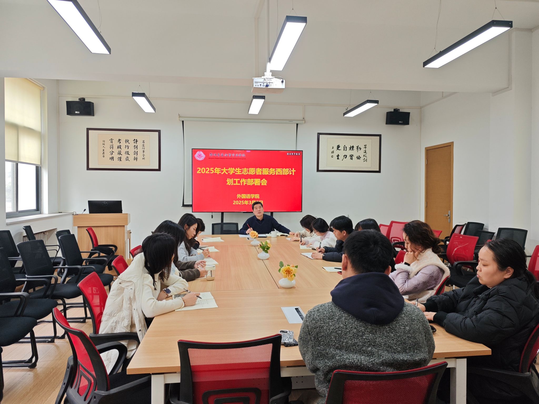 2025年3月5日下午,外国语学院在206院会议室召开了2025年度大学生志愿者服务西部计划工作部署会。会议由院党委书记石皓召同志主持,行政秘书及全体辅导员参会,共同为青年学子的志愿服务之路指明方向。