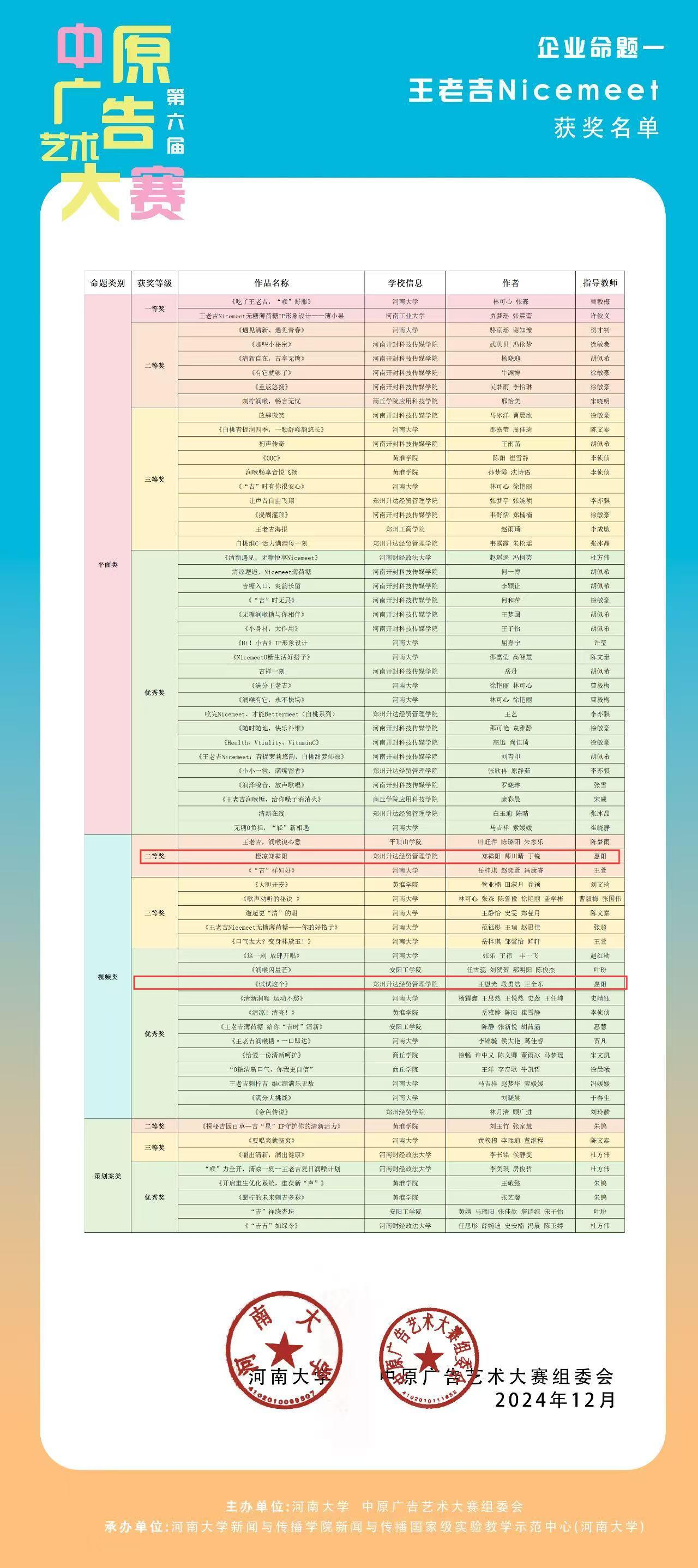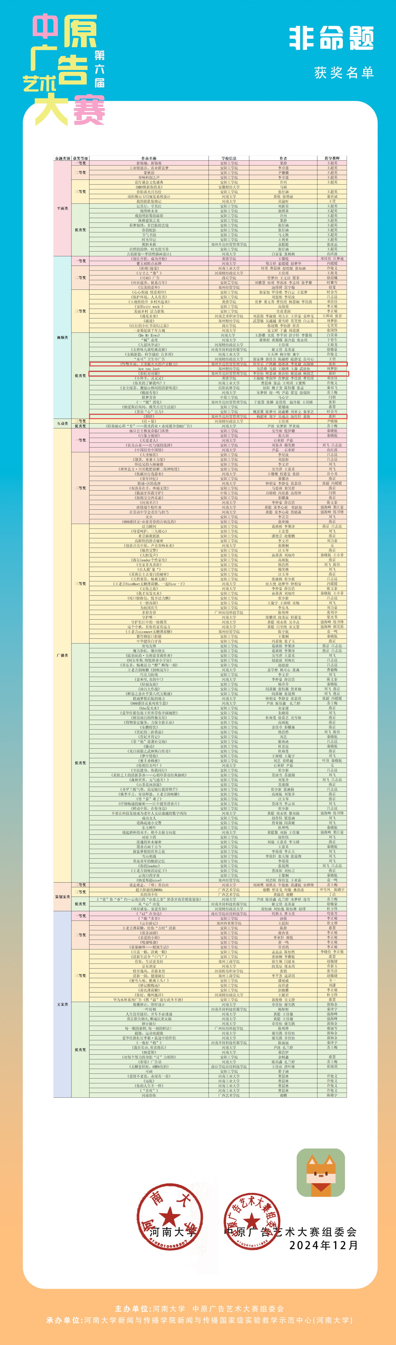 中原广告艺术大赛是由河南大学、中原广告艺术大赛组委会主办,河南大学新闻与传播学院、新闻与传播国家级实验教学示范中心(河南大学)承办,于2024年入选河南省高等学校大学生学科竞赛省级竞赛项目,是中部地区规模大、覆盖面广、参与师生人数多、作品水准高、有较大社会影响力的高校文科竞赛和创意实践教学改革平台。