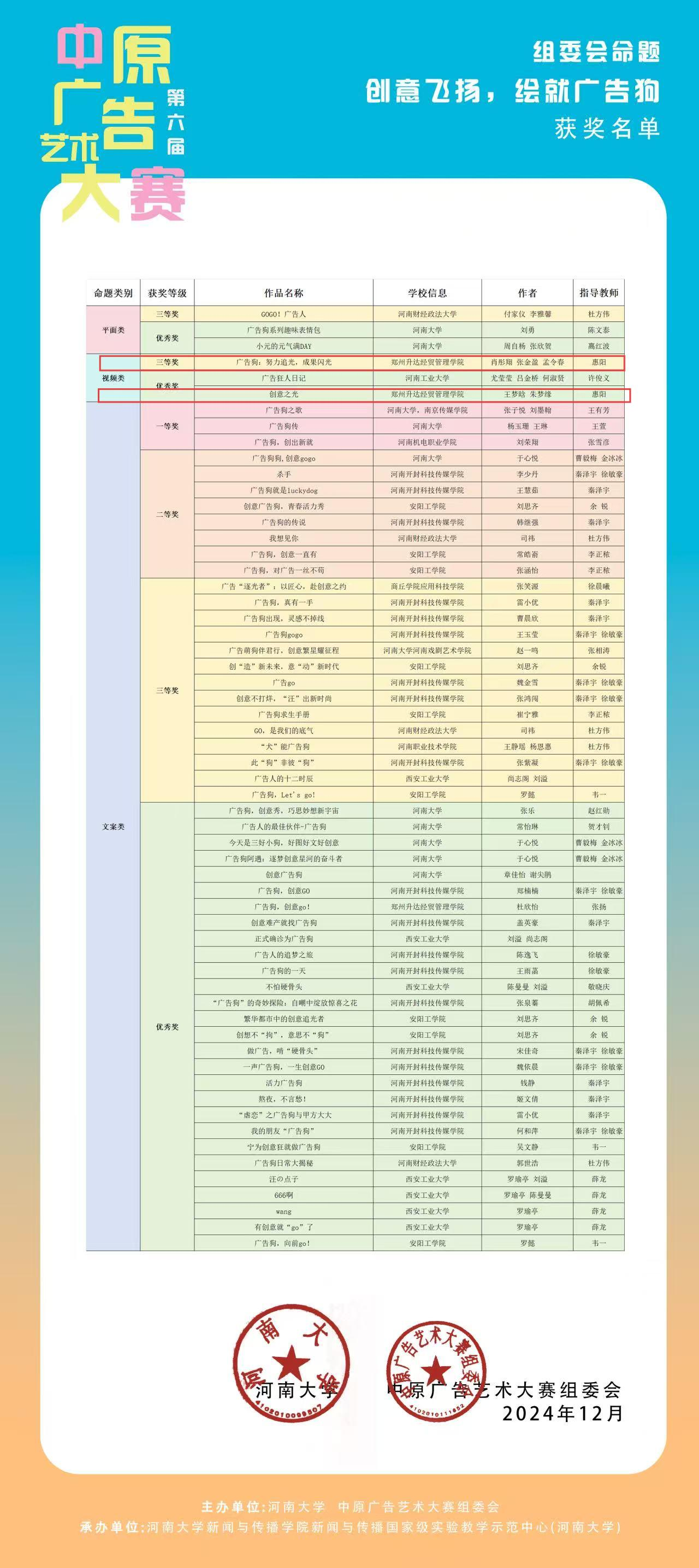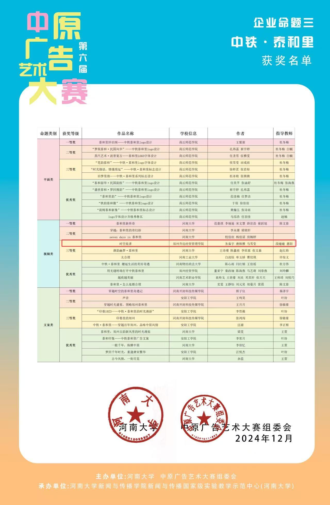 第六届中原广告艺术大赛近日圆满落幕,网络与新媒体学生在惠阳、段曈曈、张彩三位老师的指导下,积极准备作品,按照大赛要求参赛。过评委专家评选,我校文法学院共有8项作品在影视、短视频、微电影中喜获佳绩,其中郑霜阳等三位同学创作的《橙凉郑霜阳》获得省级二等奖,肖彤翔等三位同学创作的《广告狗:努力追光,成果闪光》,务枭宇等三位同学创作的《时空旅者》分别获得省级三等奖,田卓尔等五位同学创作的《咔嚓革命:卫龙脆火火的声音魅力》,杨超亚等五位同学创作的《拥挤》获得省级优秀奖。惠阳、段曈曈、张彩获得“优秀指导教师”称号。