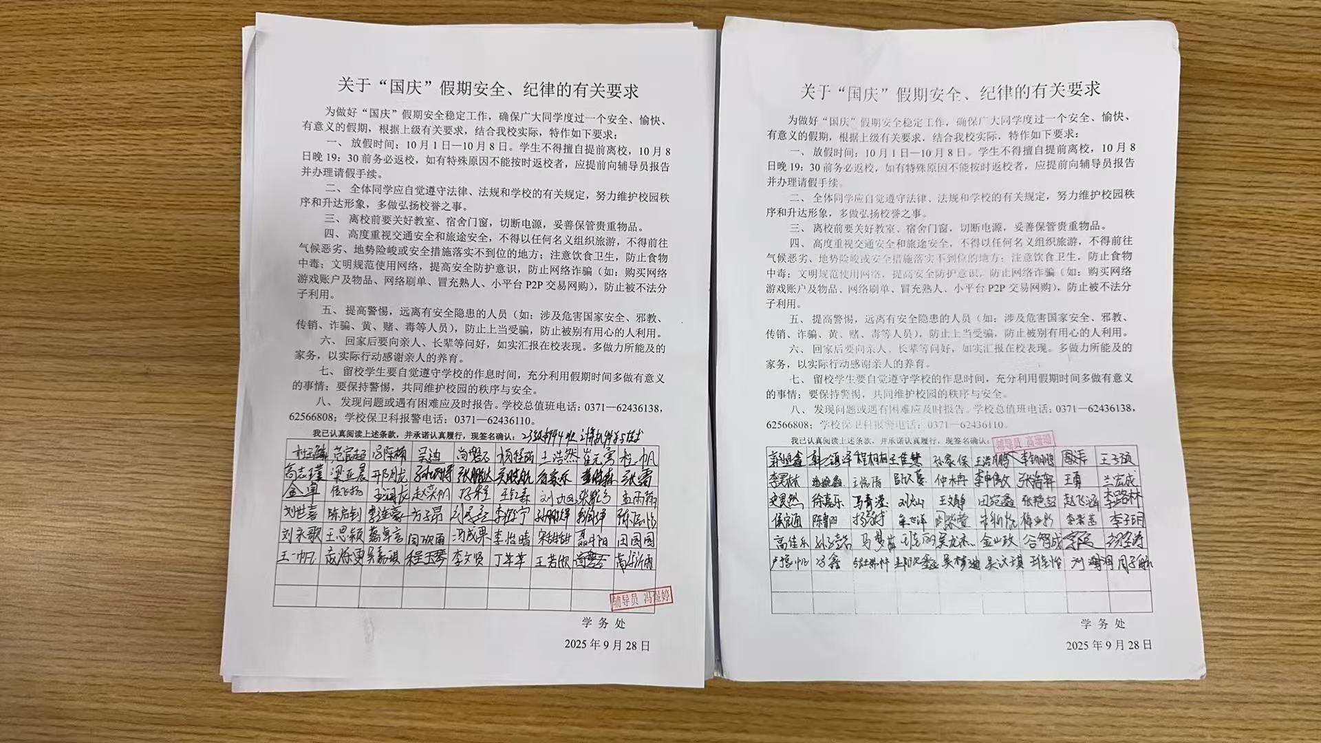 在班会开展过程中,各班专门组织学生学习学校下发的《关于十一假期学生安全纪律的有关要求》,逐条款解读假期安全纪律、外出报备规范、应急处置流程等核心内容,确保每一位学生清晰知晓学校要求;同时,组织全体学生签署《十一假期安全纪律知晓确认书》,以书面形式强化学生安全责任意识,实现安全教育学习与签名确认“全覆盖、无遗漏”。