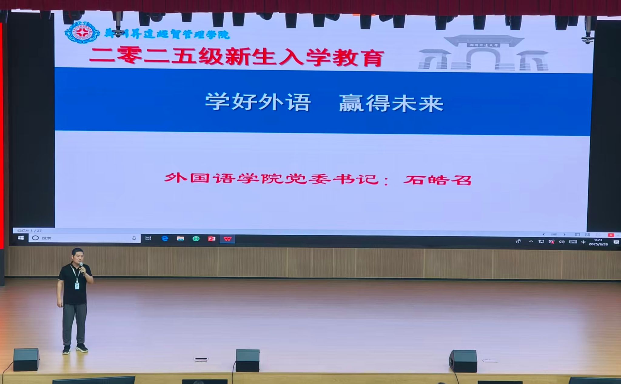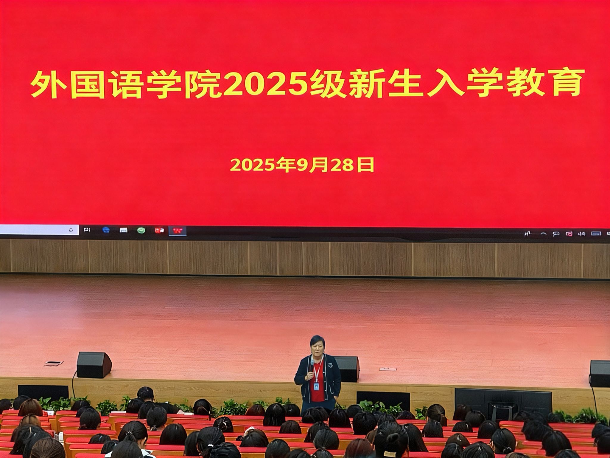 外国语学院于2025年9月28日上午为2025级新生举行了以“学好外语,畅游人生”为主题的入学教育讲座。本次活动旨在引导新生们深刻理解外语学习的价值与意义,为他们的大学生活指明方向、奠定基础。讲座由教学秘书祁胜利老师主持,外国语学院院长王莉莉教授、党委书记石皓召同志先后致辞讲话,现场气氛热烈,新生们反响积极。
