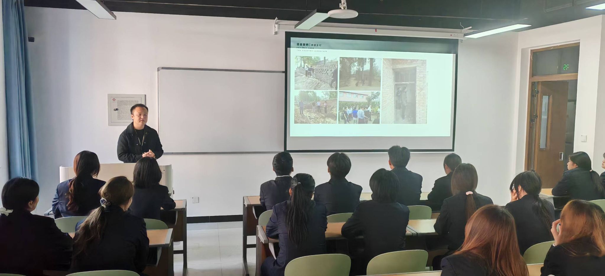 随后,张华老师以“艺术、景观设计、室内设计、文创设计”为题为新生介绍环境设计专业基本情况,首先,对大学课程体系做系统介绍,明确各课程的学习内容、需达成的能力目标及课程间的衔接逻辑,既简化表述,又让课程信息更有条理,其次通过生动的课程案例,让同学们更好地理解环境设计专业的目的,鼓励同学们,从今天起,你们拥有了一个共同的身份——艺术空间的塑造者、创作者与体验者。环艺专业是一个充满挑战与魅力的领域,它横跨于建筑学与艺术之间,连接着公共与私密、人与自然。我们的核心使命,就是学会用专业的设计语言,去营造更美好、更可持续的人居环境。接着,为了更好地帮助学生认识“专业实践”的重要性,张华老师向新生们介绍了艺术学院师生共同参与完成的实践项目:“黄河玉门古渡项目旅游策划研究”、“泰山文旅健身中心改造项目”、“美丽新农村建设”等多项实地项目,主要包括项目的前期构思,项目的设计思维,与项目的最终落地成果展示,学生通过丰富的实践案例介绍认识到专业实践的重要性,对环境设计专业有了更多的认识。