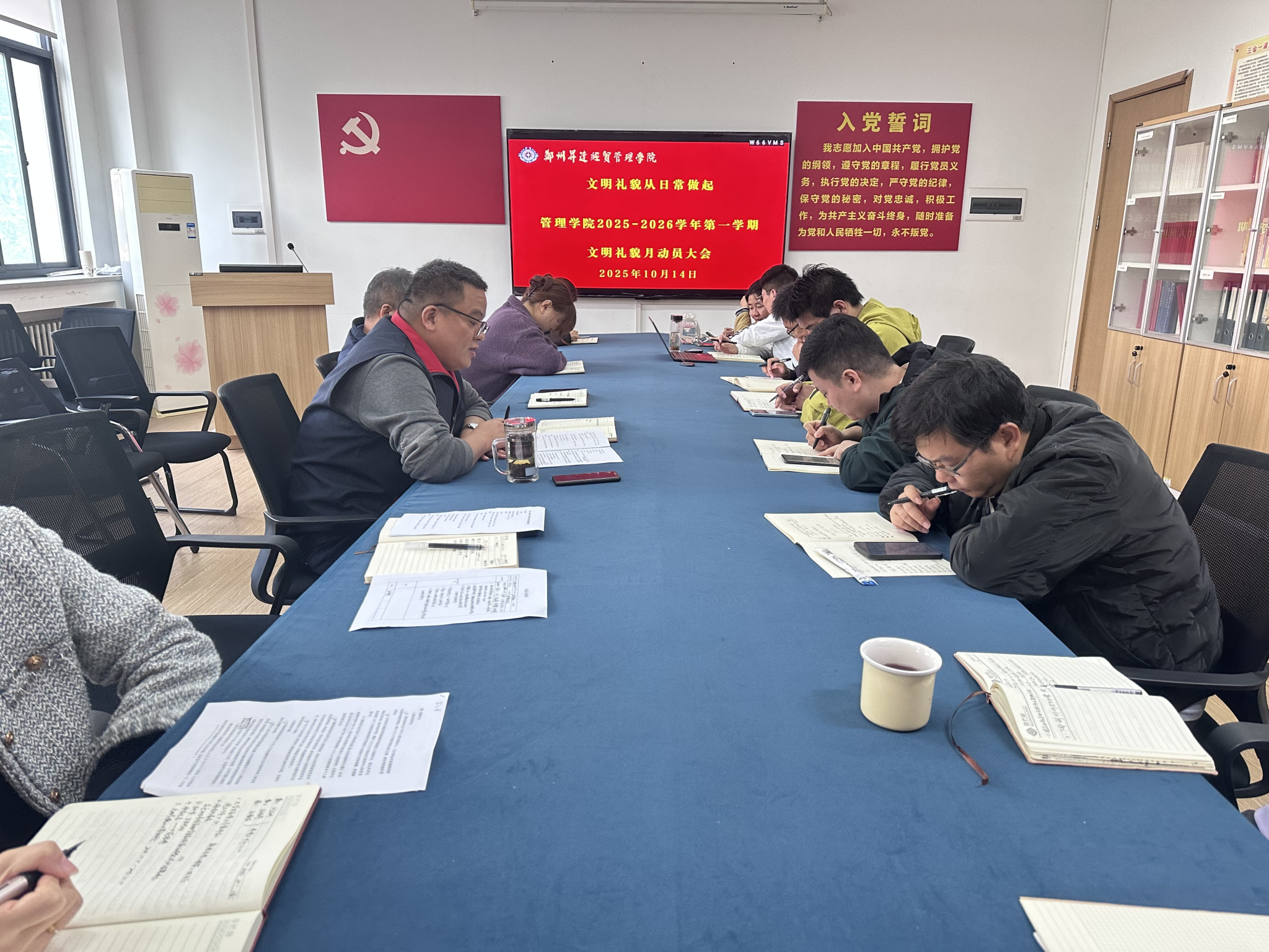 2025年10月14日下午,管理学院在教学2号楼305会议室召开“文明礼貌月”活动动员大会,本次活动以“文明礼貌从日常做起”为主题,将文明礼仪教育贯穿于学生生活的各个方面,参加会议的有管理学院党委书记职正路、副书记许广庆以及全体辅导员。