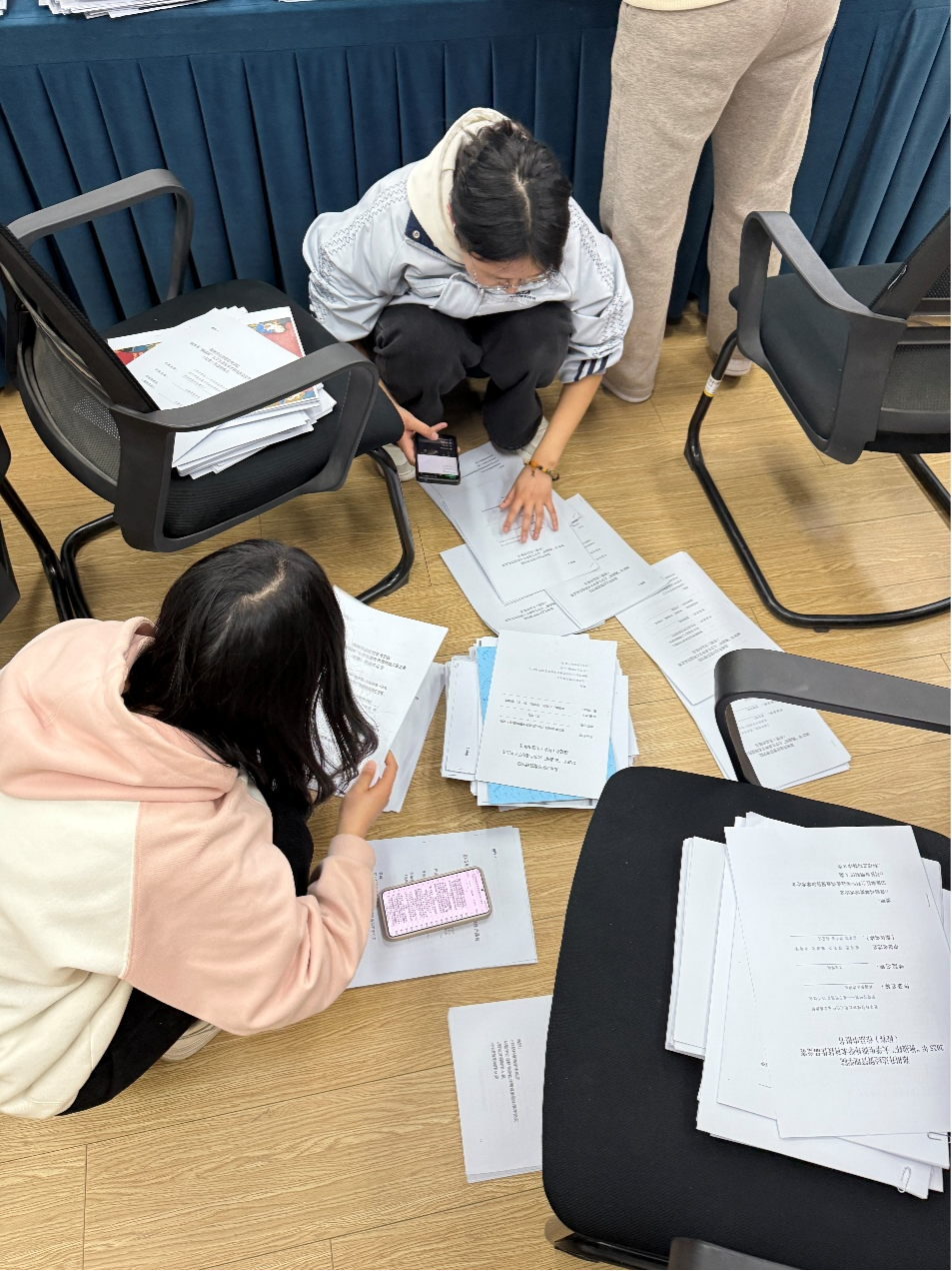 在为期三天的活动中,志愿者们面临着繁重的工作任务。大量的参赛材料堆积如山,但大家毫无怨言,认真细致地对每一份材料进行分类、整理和初步评审。每一摞材料上都贴上了便签,标注着关键信息,以便后续的查阅和处理。充分体现学院对学生科技竞赛和服务保障工作的大力支持。