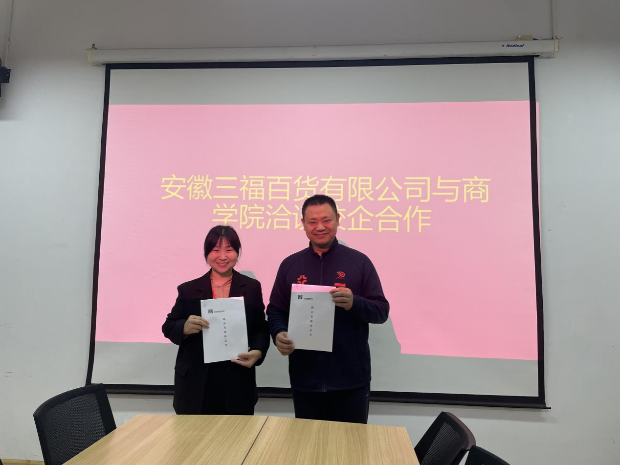 随后,安徽三福百货有限公司校招负责人沈雯表示,感谢学院近几年对安徽三福百货有限公司招聘工作的支持,并对学院培养的人才给予了高度评价,往届在企业就职的同学,目前发展的都很好。希望能够与学院建立深度的合作关系,也为后续校企间的合作打下基础。最后,郭峰书记代表商学院与安徽三福百货有限公司正式签订《校企合作协议》。
