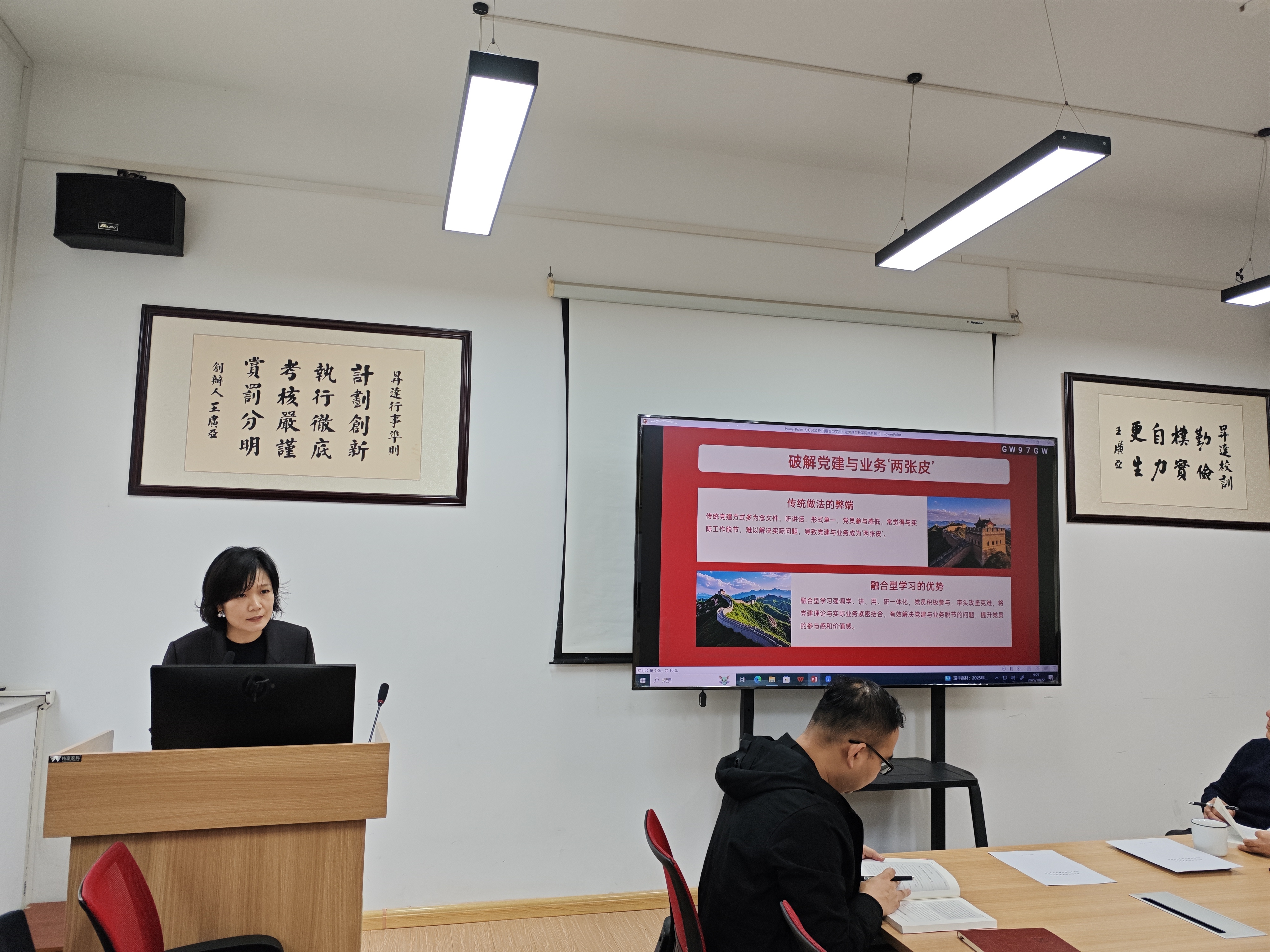 随后,王晓静同志以“融合型学习:让党建与教学同频共振”为主题,领学了第三篇相关内容。她强调,政治理论学习不应孤立于业务工作之外,而应与教师的教学能力提升、课程思政建设、科研团队发展紧密结合。她分享了所在党支部将主题党日与集体备课、教学研讨相融合的具体做法,展示了“党建促教、教中强党”的实践成效,引发与会人员广泛共鸣。