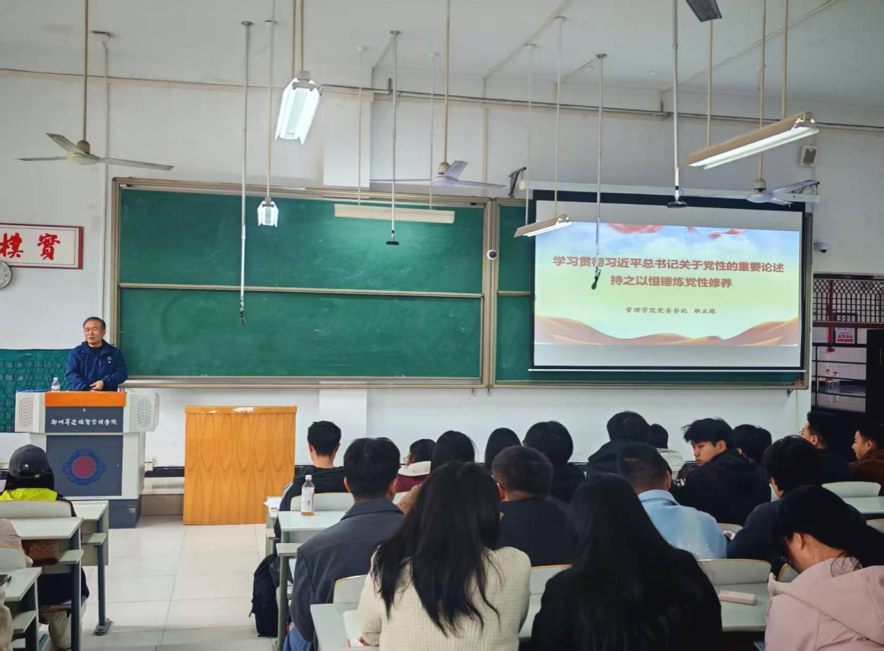 10月23日下午,管理学院党委书记职正路以《学习贯彻习近平总书记关于党性的重要论述,持之以恒锤炼党性修养》为题在时金楼116教室为管理学院、机电学院、体育学院第22期党课学员讲授党课。