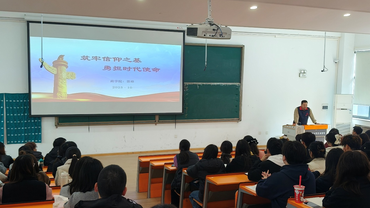 10月28日中午,商学院党委书记郭峰以《筑牢信仰之基,勇担时代使命》为主题在教学楼2号楼116教室为第22期党课学员讲授专题党课。