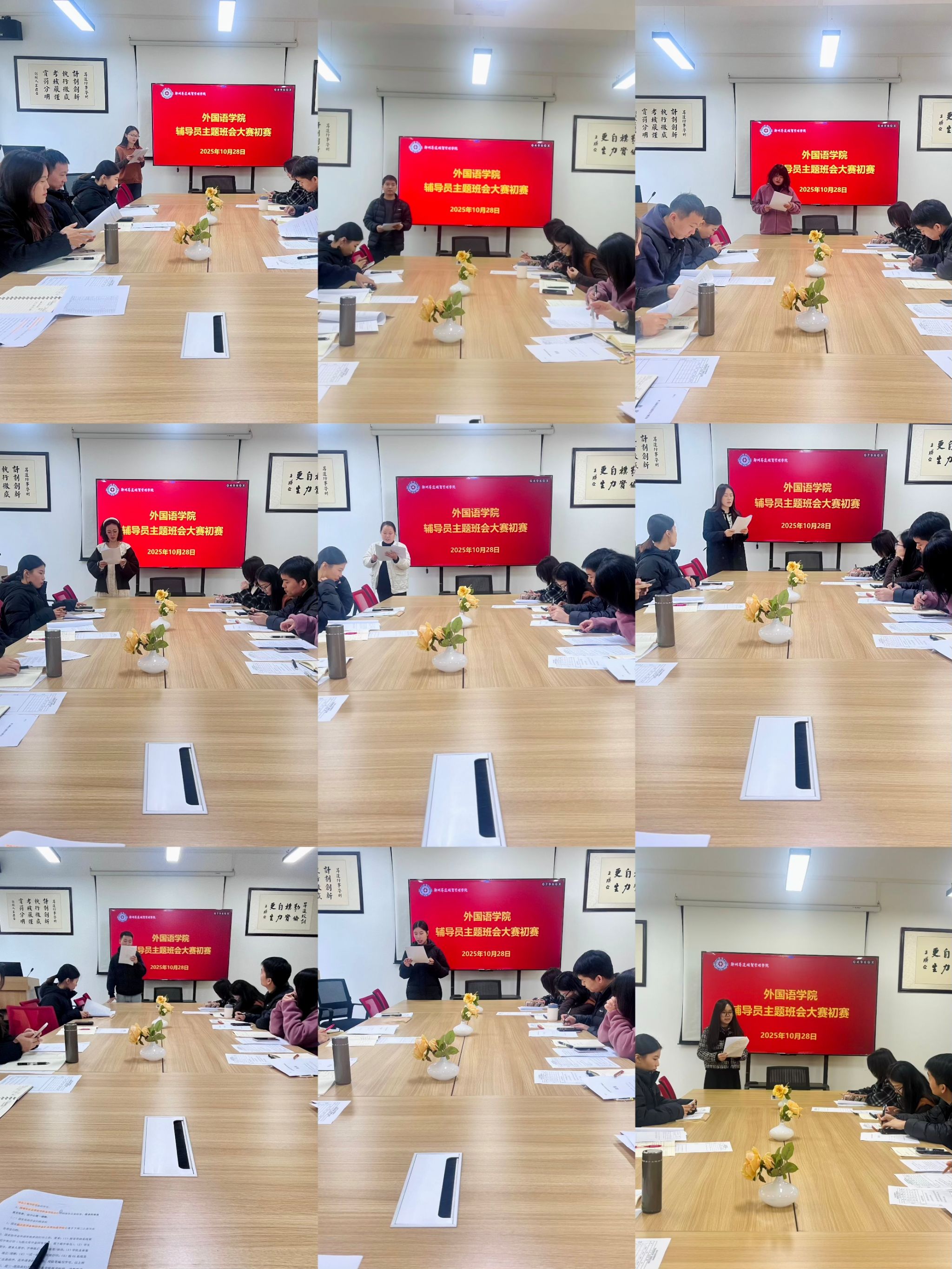 为深入贯彻落实学校育人工作要求,全面提升辅导员队伍的专业能力与职业素养,外国语学院于10月28日下午在教一楼206会议室成功举办了第二届辅导员主题班会大赛院级初赛。学院全体九名辅导员参赛,最终三人表现优异,荣获晋级校级比赛的资格。