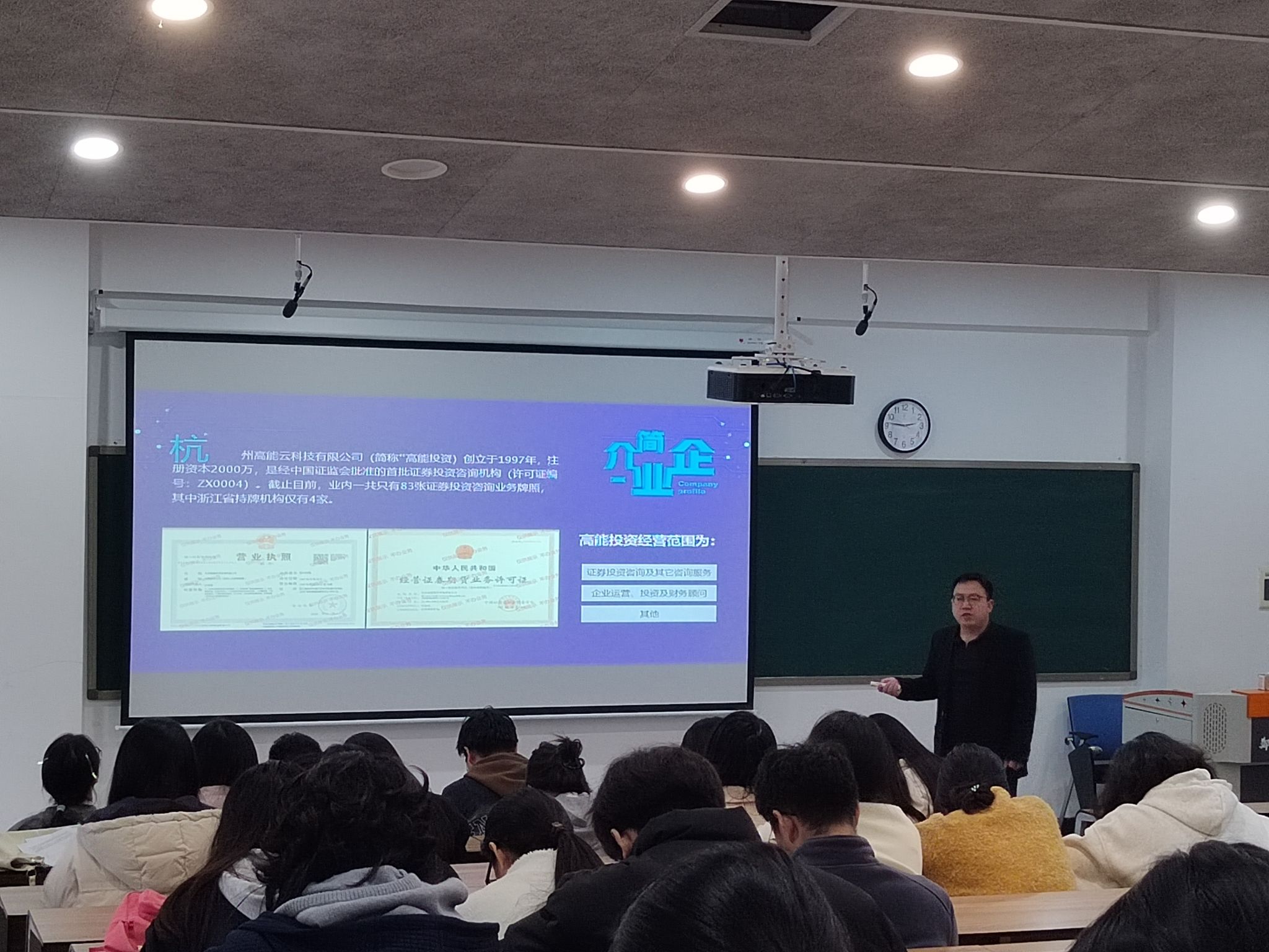 宣讲伊始,李老师首先对高能云科技的企业概况进行了介绍,重点强调了公司两大核心优势——专业资深的投资顾问团队和完善的售后服务团队。他详细阐述了投资顾问团队成员的专业背景与实战经验,指出团队凭借精准的市场研判能力,为客户提供专业投资建议;同时,售后服务团队以“高效响应、贴心服务”为宗旨,通过完善的服务体系保障客户权益,这两大团队共同构成了企业的核心竞争力。在互动环节,李老师采用提问的方式与同学们进行交流,针对大家关心的岗位晋升机制、薪资待遇、专业技能要求等问题进行了详细解答。