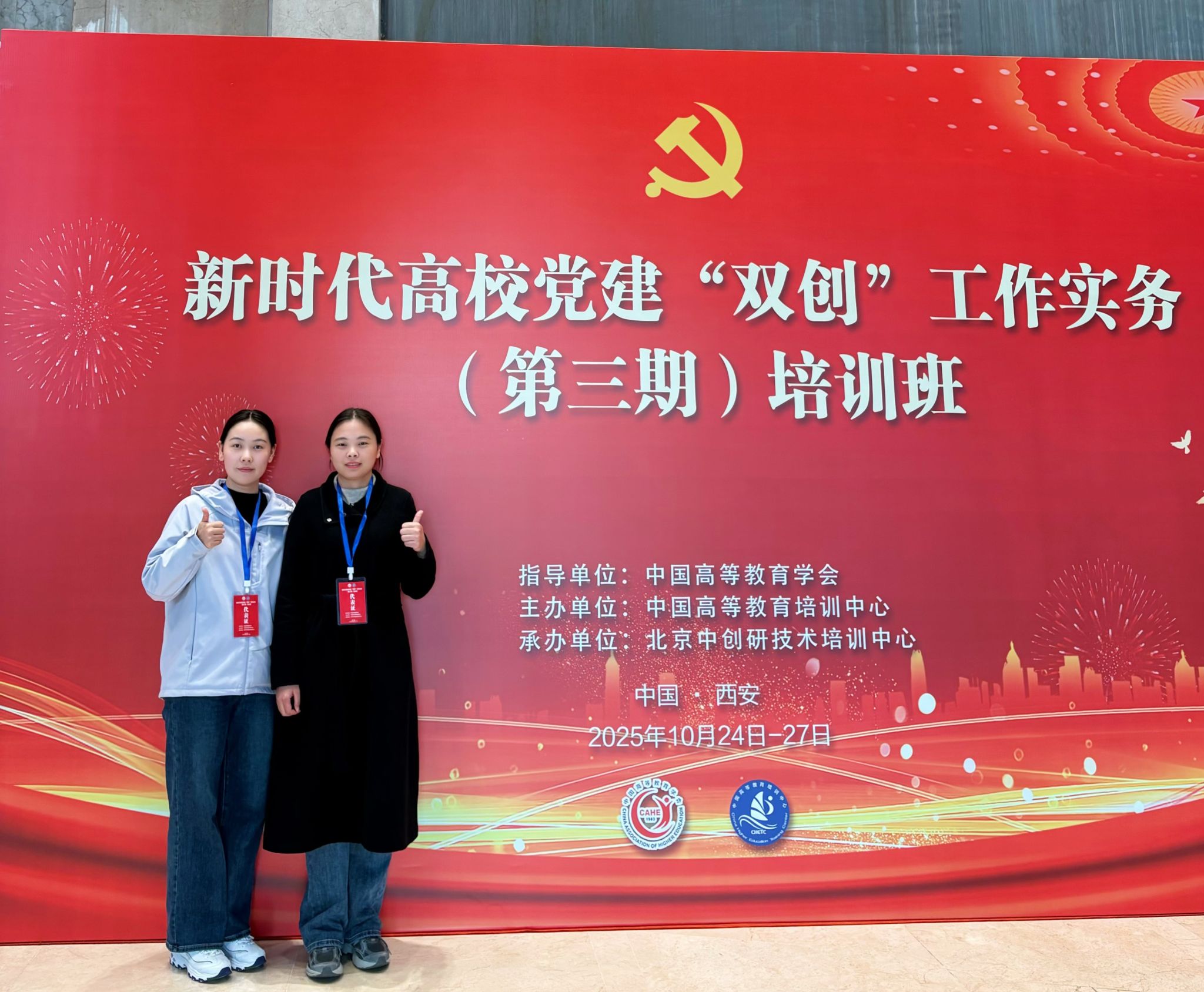新时代党建“双创”工作实务培训班(第三期),于2025年10月24日至27日在陕西省西安市隆重举行,本次培训班由中国高等教育学会指导,中国高等教育培训中心主办,文法学院组织员刘瑞与学前教育专业学生第二党支部书记刘欣欣参加此次培训。
