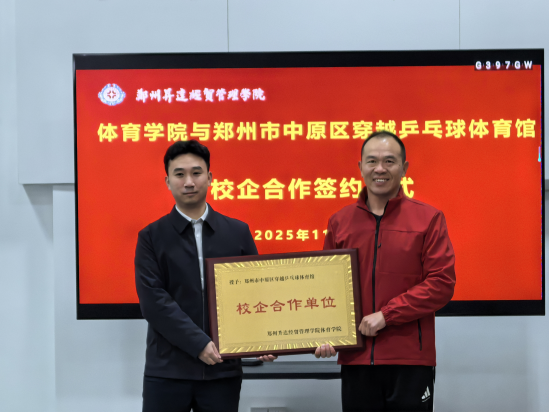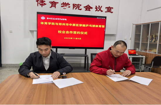 2025年11月6日,郑州升达经贸管理学院体育学院与郑州市中原区穿越乒乓球体育馆校企合作签约仪式在体育学院208会议室顺利举行。体育学院公体教研室主任巴义然、穿越乒乓球体育馆负责人孙川代表双方签署校企合作协议,共同开启体育人才培养与实践教学协同发展新篇章。