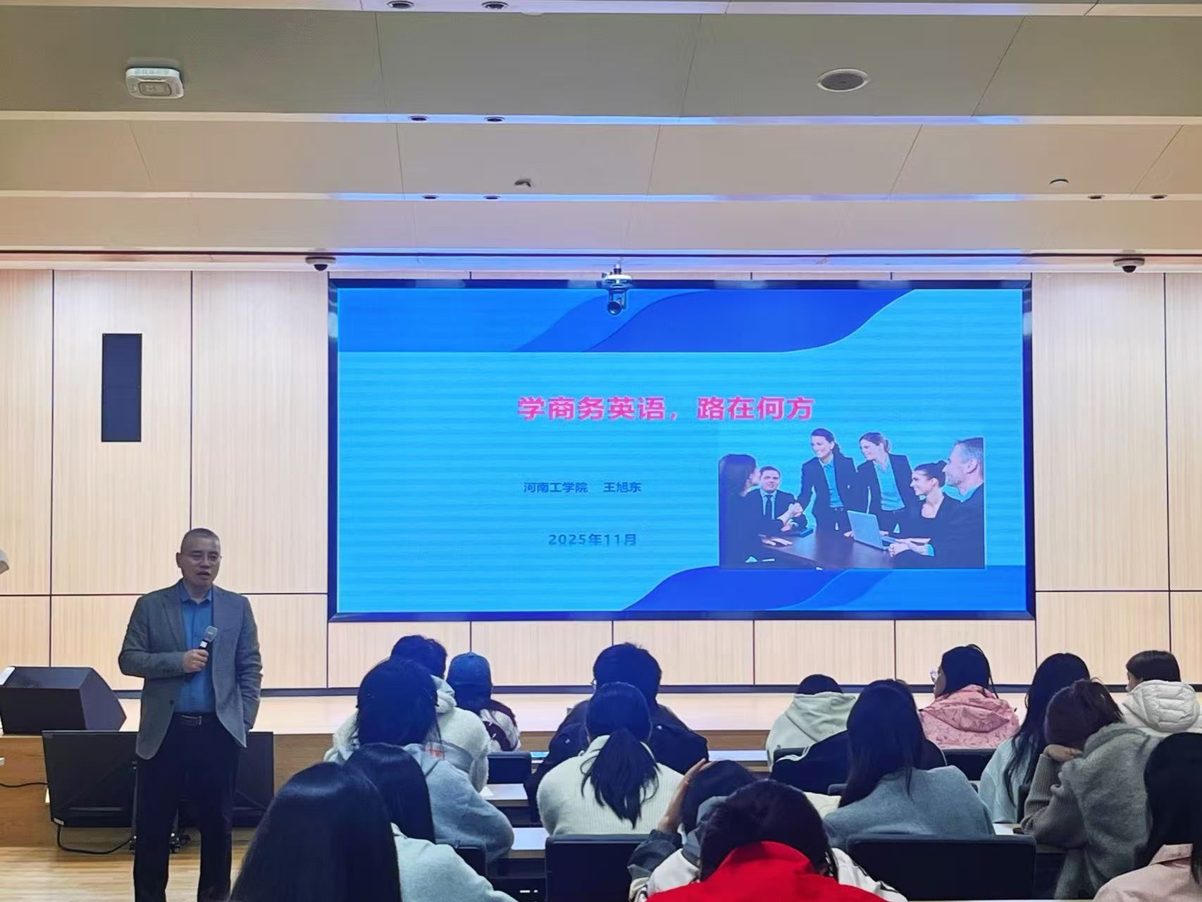 11月4日,河南工学院外国语学院王旭东副院长应邀莅临我校外国语学院,在图书馆第一报告厅为我校商务英语专业师生举行了题为“学商务英语 路在何方”的主题讲座。