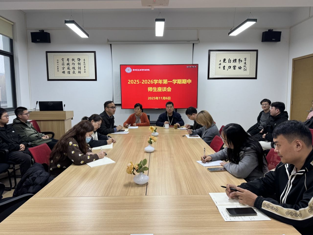 为精准把握教学动态,倾听师生心声,破解育人过程中的痛点难点问题,2025年11月6日下午,外国语学院召开2025-2026学年第一学期期中师生代表座谈会。外国语学院院长王莉莉、党委书记石皓召、副院长贺光辉、教学秘书祁胜利、各教研室主任、教师代表以及各班学生代表齐聚一堂,以面对面交流的形式搭建沟通桥梁,为学院新学期的教育教学工作指明优化方向。