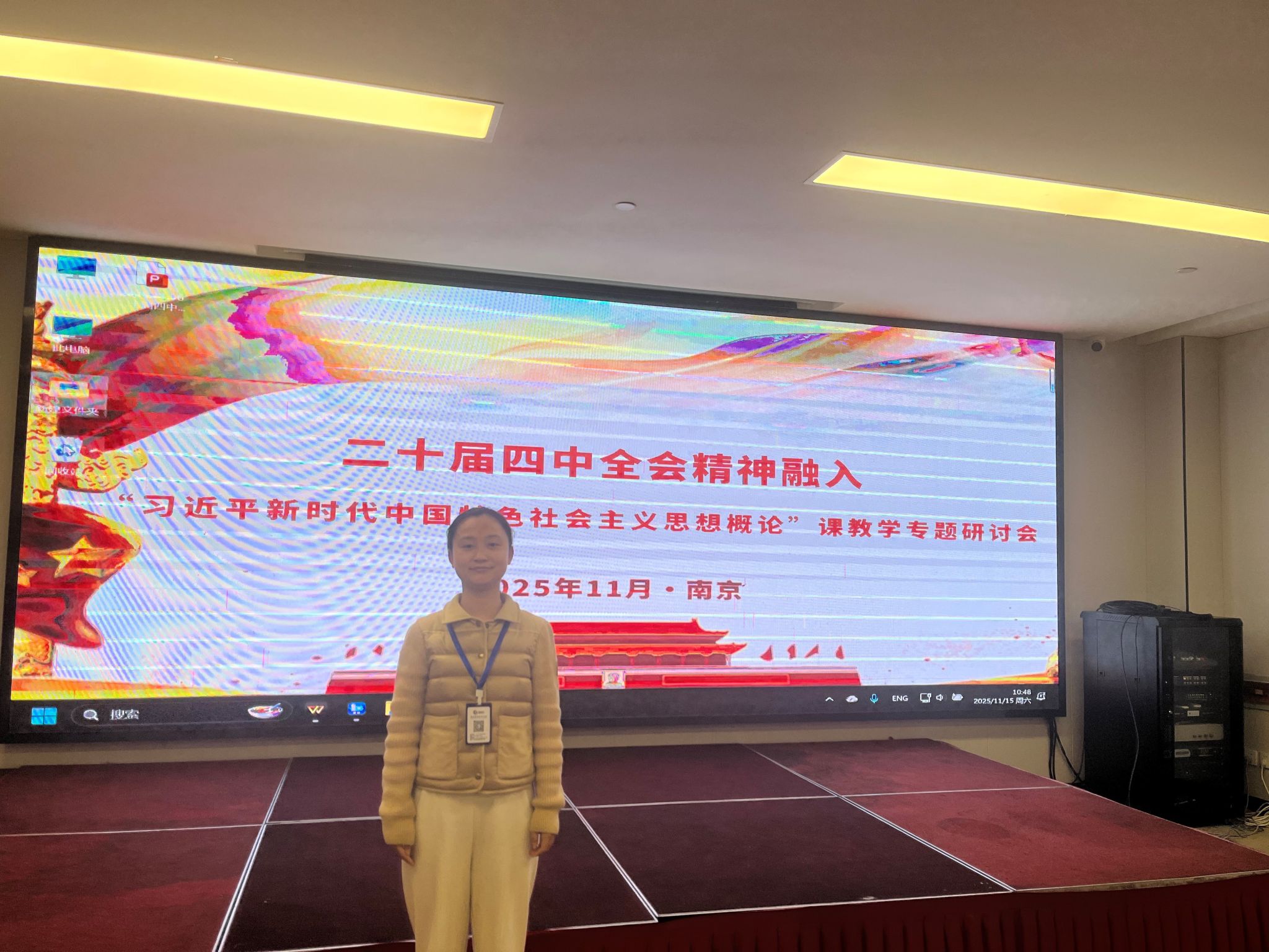为切实将二十届四中全会精神及时、准确融入到教学实践,与党的创新理论武装同步推进,守正创新推动课程建设内涵式发展,更好发挥立德树人关键课程作用,我院教师陈静怡于11月14—16日参加了由高等教育中心主办的二十届四中全会精神融入《习近平新时代中国特色社会主义思想概论》课教学专题研讨会。