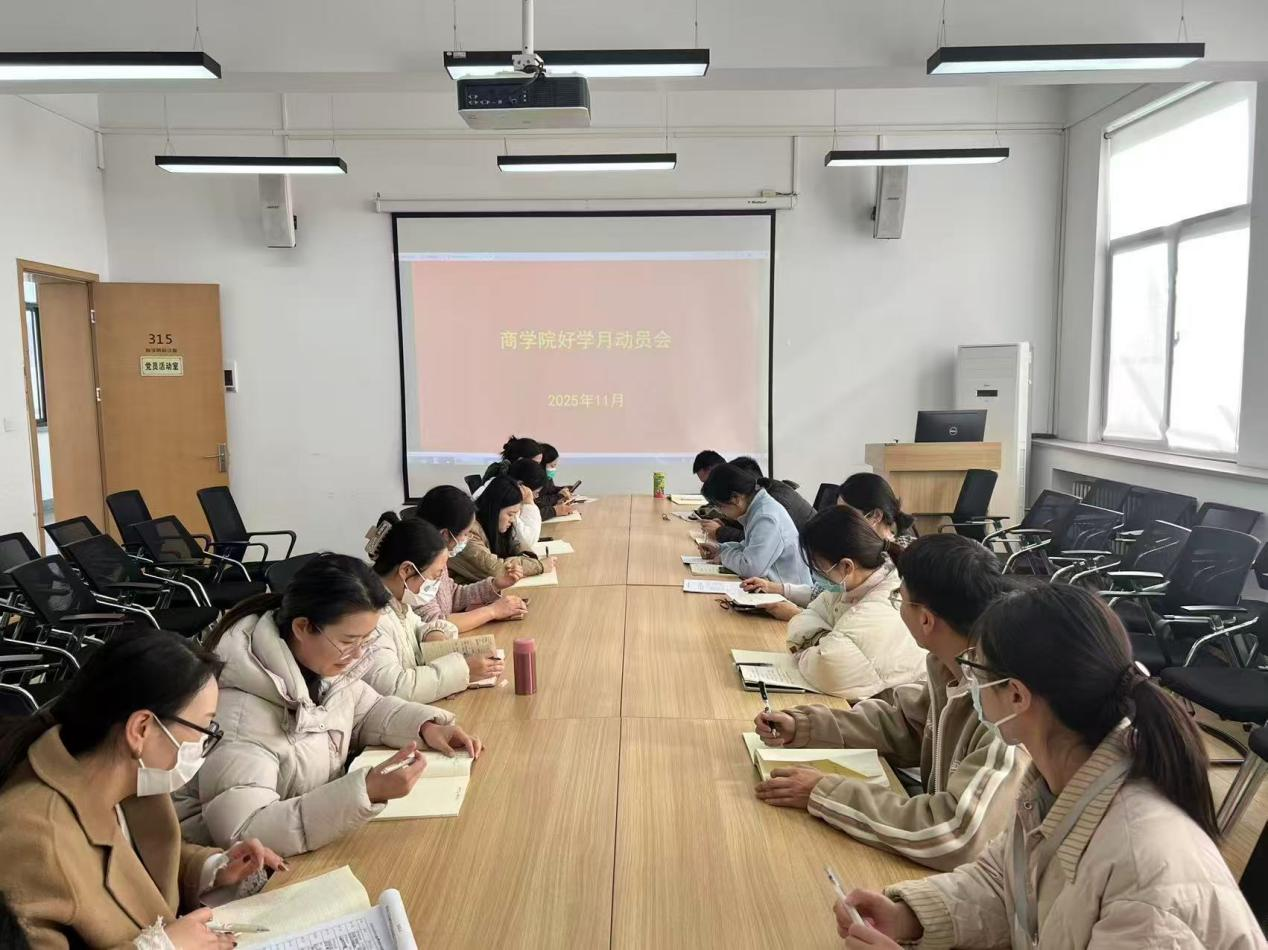 为深入贯彻落实我校“好学月”活动方案的相关要求,切实提升育人成效,进一步激发学生学习热情,营造良好的学习氛围。2025年11月25日,商学院在教学2号楼315会议室召开“好学月”动员会。会议由商学院党委副书记郗艳花主持,商学院全体辅导员参加。