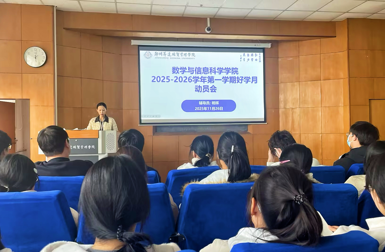 会上,辅导员杨辉详细介绍了“好学月”活动的具体内容与实施方案,传达了学校相关要求,引导学生注重日常体育锻炼,提高身体素质,落实每日8000步目标;倡导学生珍惜大学时光,合理规划课余时间,科学安排学习生活;加强诚信教育,严肃考风考纪,做到诚实守信,杜绝考试作弊行为。积极引导学生端正学习态度,遵守课堂纪律,坚持体育锻炼,严守考试诚信,充分利用碎片时间,积极进取,共同营造优良学风。