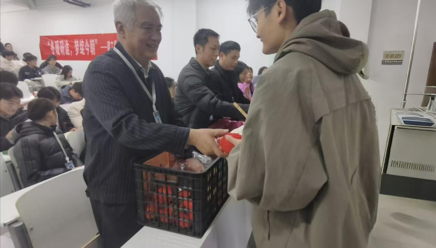 活动在播放精心制作的考研祝福视频中拉开帷幕。视频中,学院领导、老师与学弟学妹们一起为考研学生送上真挚祝福,为备考路上的学子们注入了别样的动力。活动现场,学院领导、老师为考研学生发放带有“上岸”字样的书签、一“研为定”文创帆布袋、寓意平安上岸的苹果、心想事成的橙子、妙笔生花的中性笔,还为学生准备了考研最后冲刺资料。