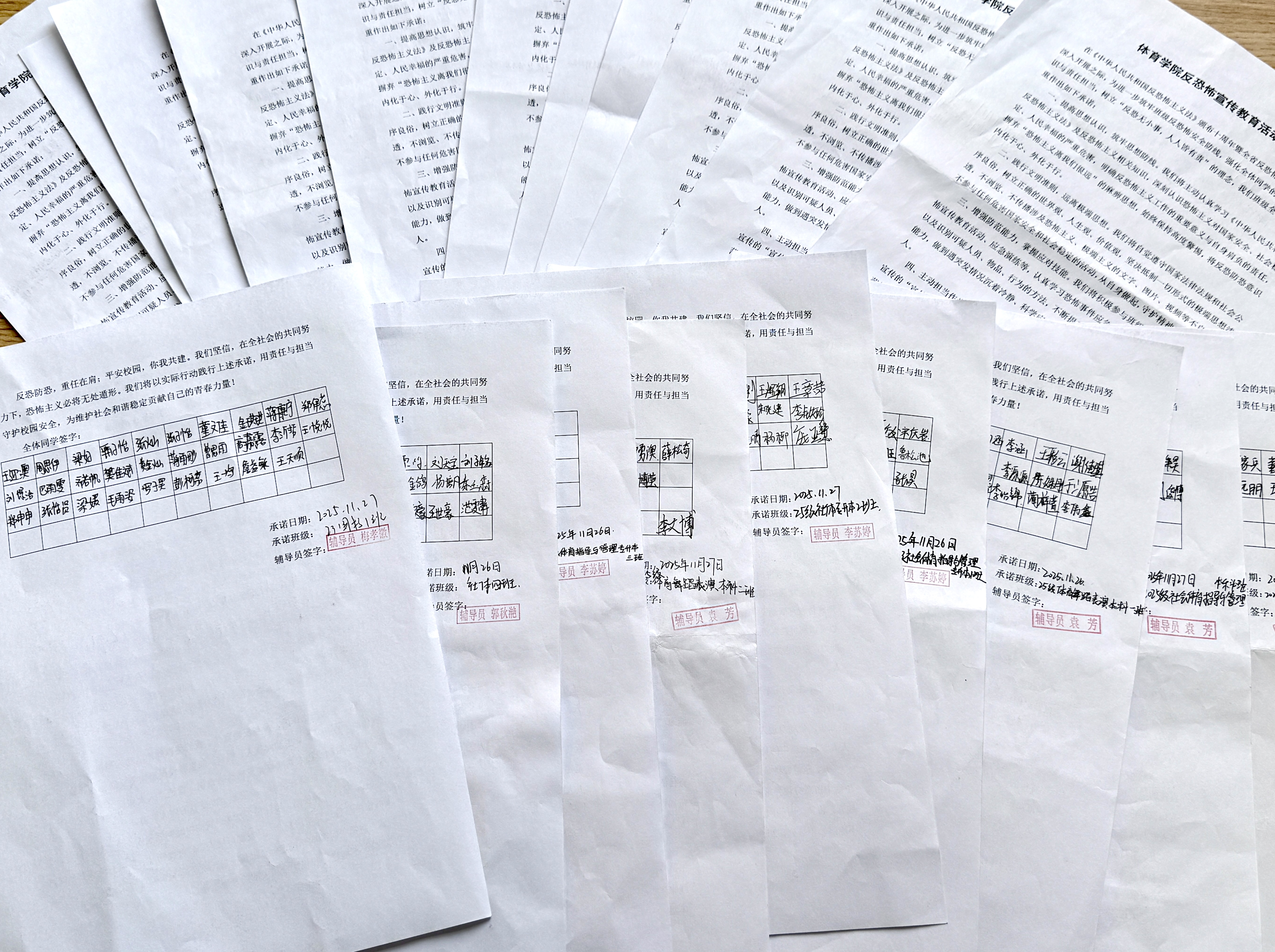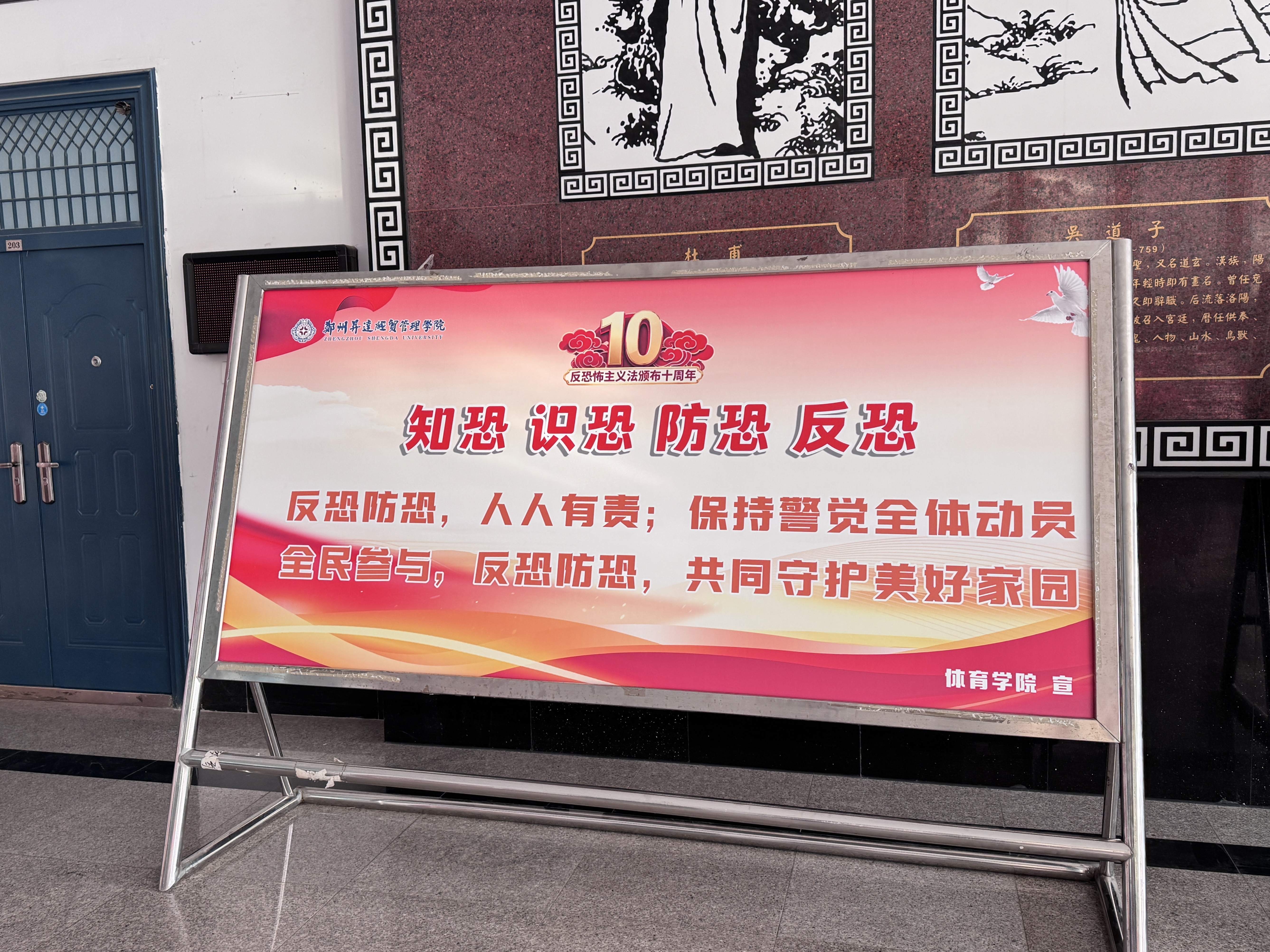加强宣传教育,筑牢思想安全防线。活动初期,学院高度重视基础宣传教育。通过线下展示“知恐、识恐、防恐、反恐”主题展板,对反恐怖内容进行宣传,使学生意识到反恐怖教育的重要性。各班级积极召开反恐怖宣传教育主题班会活动。辅导员老师们以《中华人民共和国反恐怖主义法》为核心领学内容,结合反恐维稳、重大活动安保等案例,系统讲解了相关法律条款、恐怖主义的危害、常见恐怖袭击的类型及识别方法,帮助学生掌握恐怖活动的应对处置、保护措施和法律责任。此外,各班级组织签订承诺书,增强“反恐防恐,人人有责”的安全意识,推动反恐怖知识入脑入心。