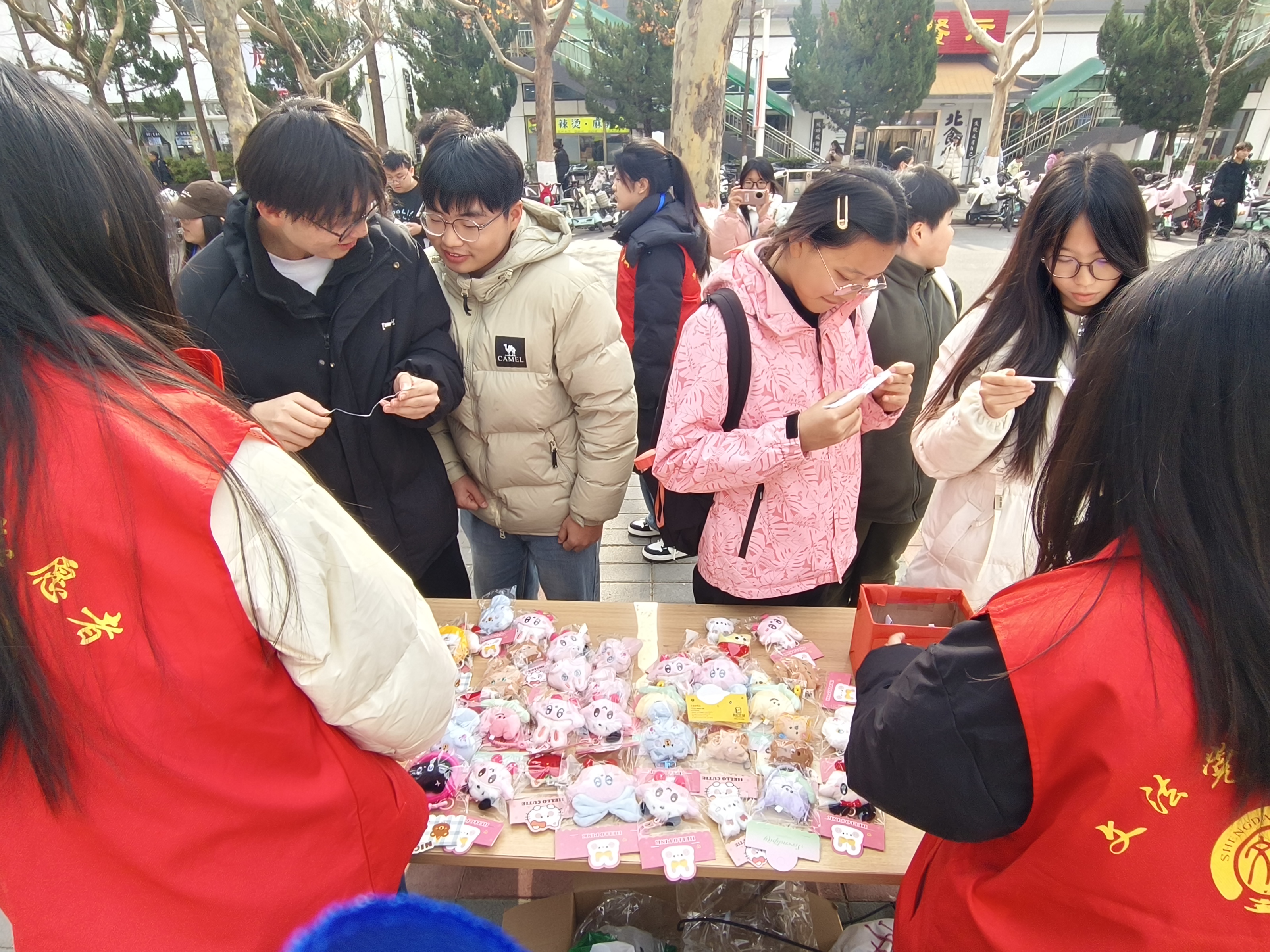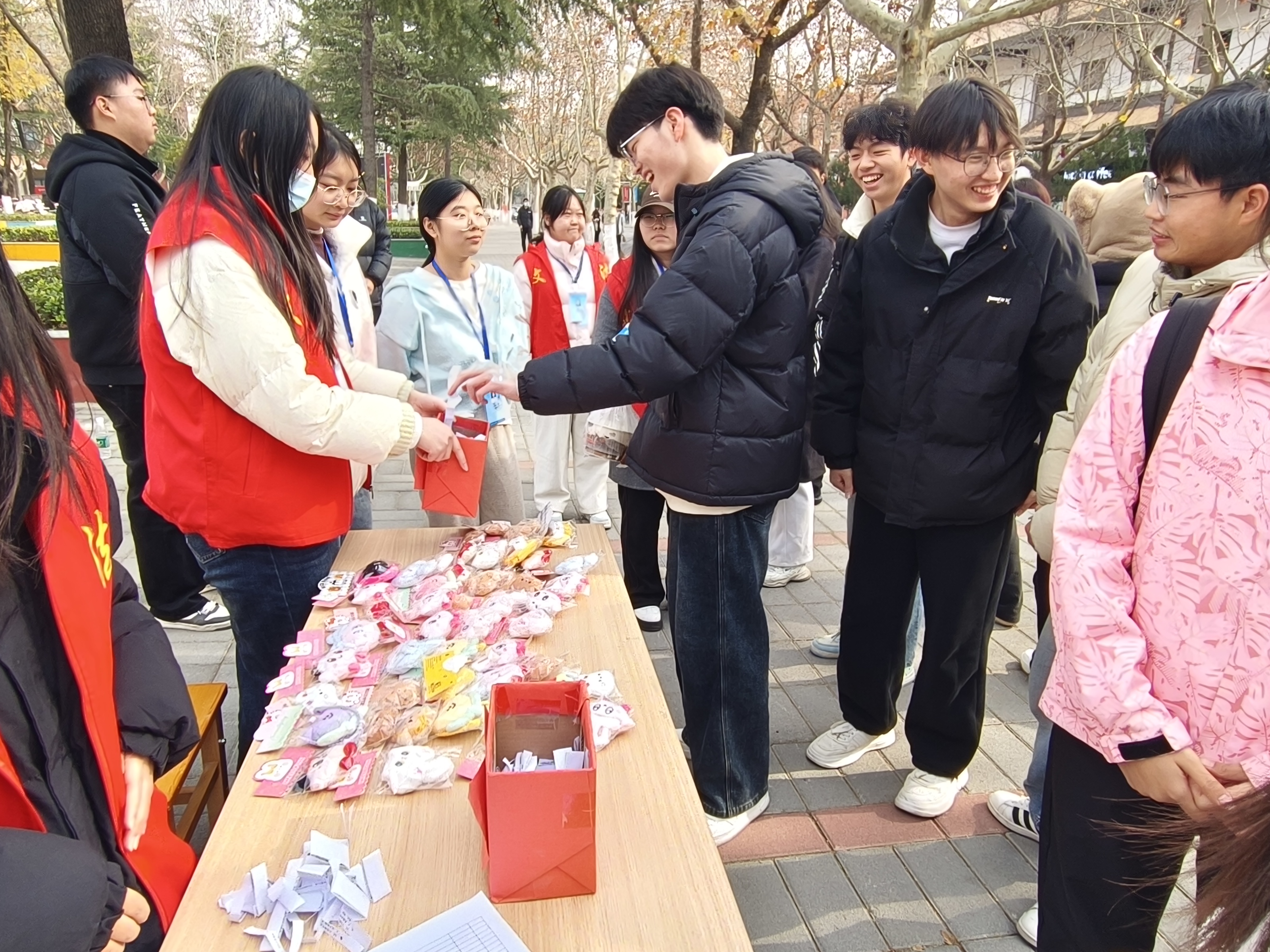在活动志愿者详细介绍了活动规则之后,活动正式拉开帷幕。本次活动精心设计为两个环节。首先进行的是党史团史答题环节,同学们依次从抽签盒中抽取3道题目。有的同学能够迅速且准确地脱口而出正确答案,而有的同学则选择在资料前仔细核对并补充作答。每答对一题,即可获得一次参与套圈环节的机会。紧随其后的套圈环节迅速将现场氛围推向高潮:参与者们站在投掷线前,将软质塑料圈奋力抛向排列整齐的奖品。每当有人成功套中,现场便爆发出阵阵欢呼;使得现场氛围愈发鲜活而真切。最终,多位同学凭借扎实的知识储备和精准的投掷技巧,成功将心仪的奖品收入囊中。