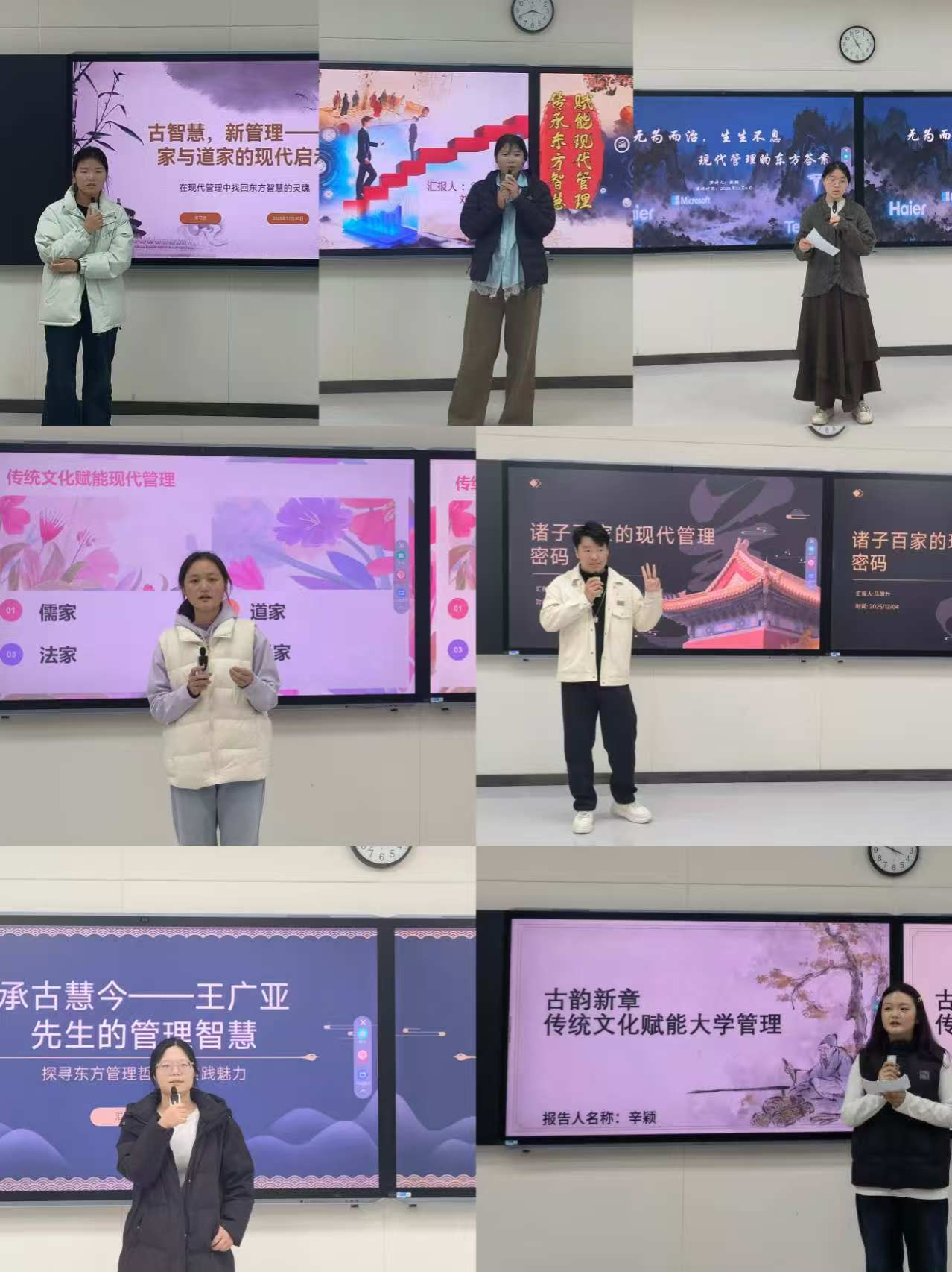 为传承中华优秀传统管理文化,探索传统管理智慧与现代管理实践的融合,我校管理学院中华传统管理文化智慧“秀”大赛于2025年12月5日顺利举办。本次大赛特邀深耕传统文化研究三十年的专家张继宏教授莅临指导,我院贺娜、李玲玲、齐丙春、陶军利、王军旗、杨征老师共同组成评委团,全程为选手提供专业点评。几十位选手登台竞技,呈现了一场传统管理智慧与管理实践交融的思想盛宴。