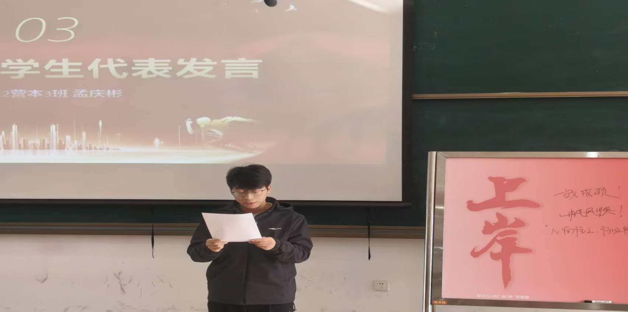 接下来,关老师播放了由成功“上岸”的往届学生代表录制的经验分享视频。视频中,学长学姐结合亲身经历,围绕复习规划、心态调整与应试技巧等方面倾囊相授,以“星光不负赶路人”的信念鼓舞在场学子,提供了切实可行的经验参考。视频结束后,2026届考研学生代表孟庆彬登台发言。他回顾了从决定考研到全力冲刺的心路历程,由衷感谢学院的暖心关怀,并表示将以更加坚定的姿态投入后续复习,不负学院与师长的殷切期望。真挚的讲述引发了现场强烈共鸣,掌声频频响起。