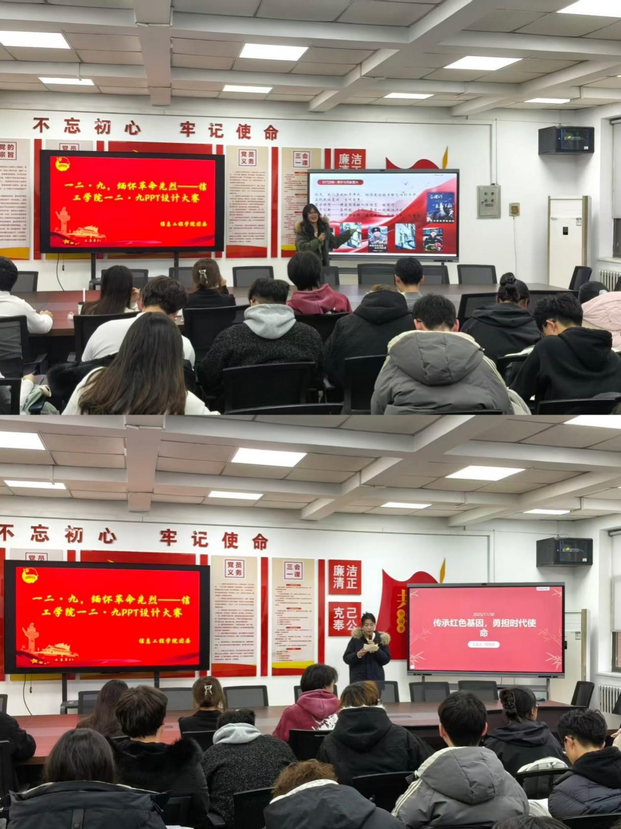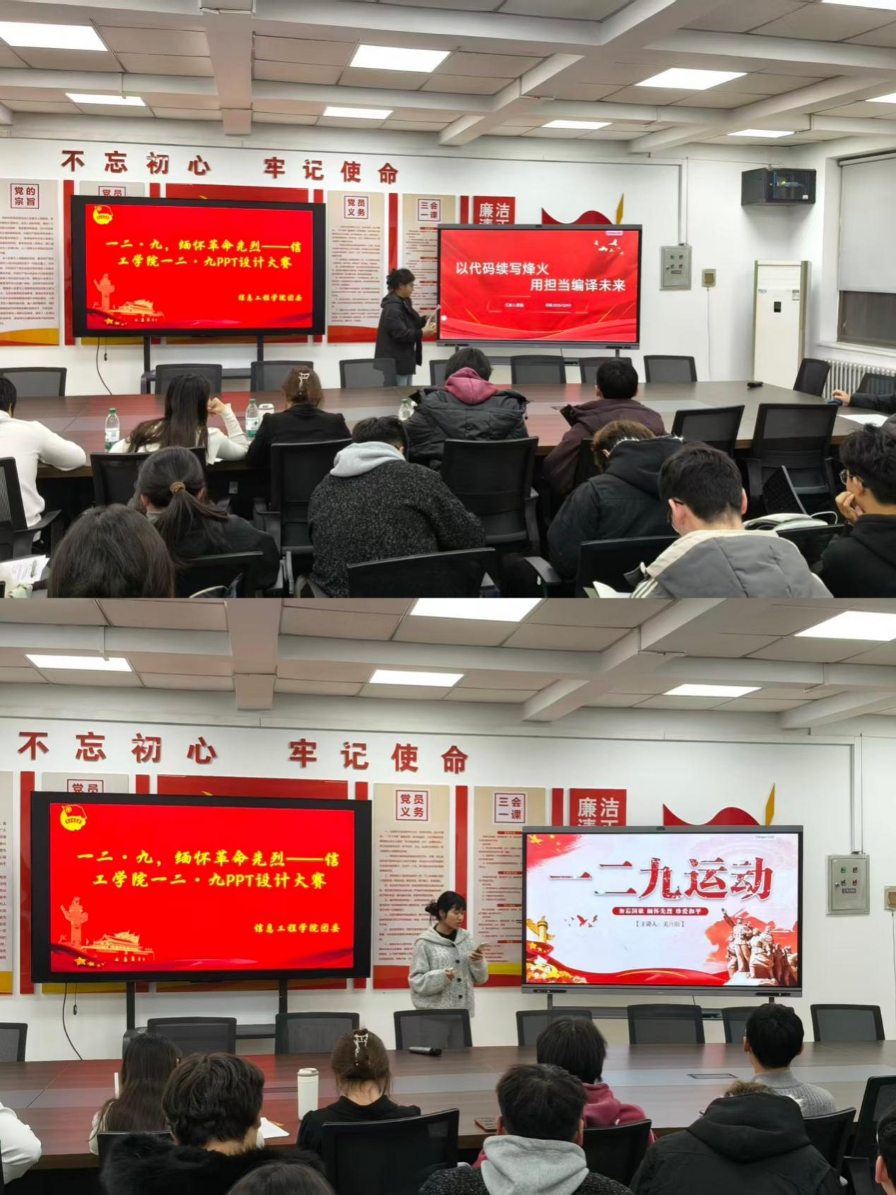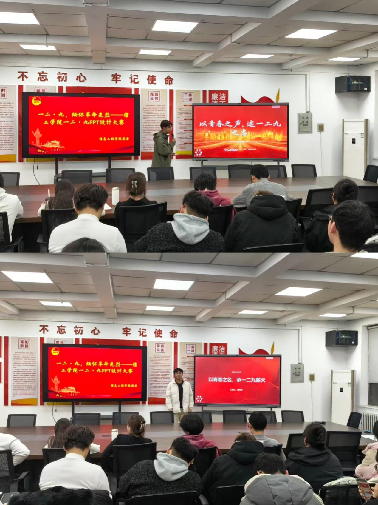 2025年12月9日下午16:15至20:40,信息工程学院于商管楼218开展“一二·九,缅怀革命先烈”PPT设计大赛,以创意设计致敬一二·九运动历史,深入弘扬爱国主义精神,激发青年学子的爱国情怀与时代担当。
